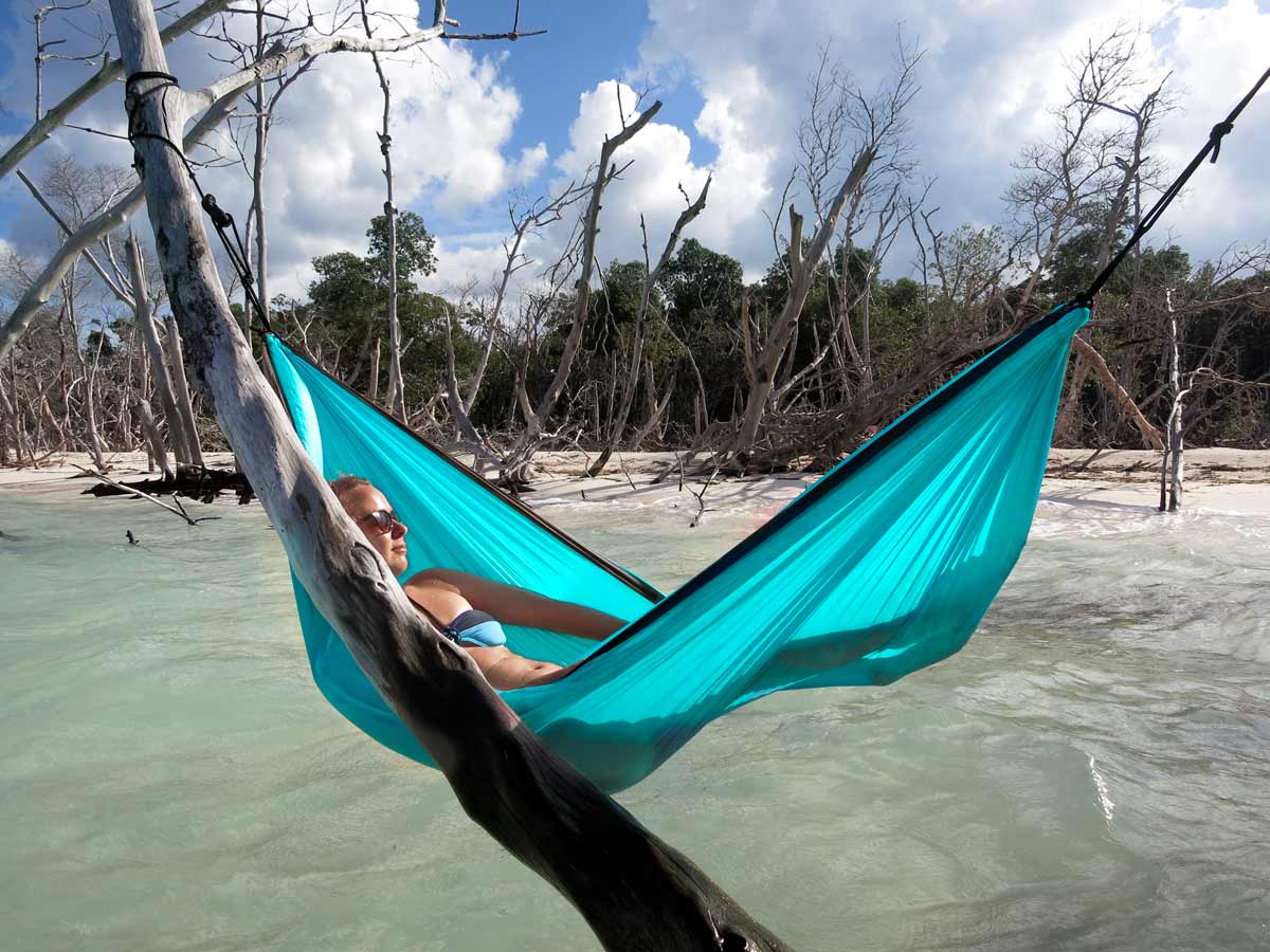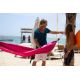 Grazie alle sue funi di sospensione asportabili, l'amaca da viaggio Colibri si trasforma facilmente in una coperta da spiaggia.