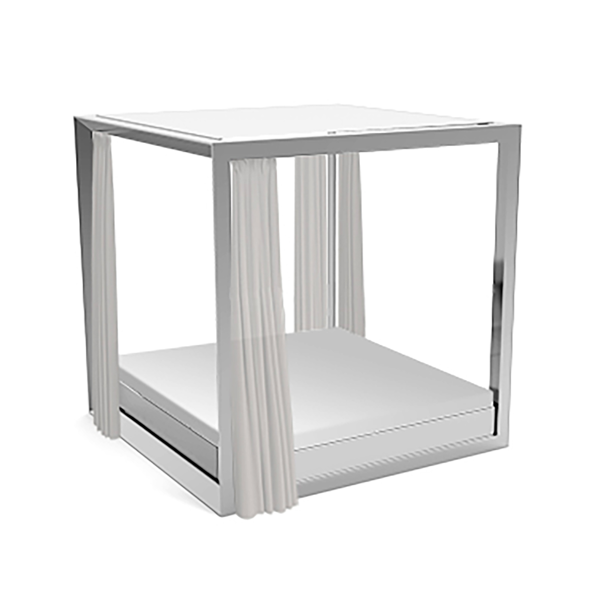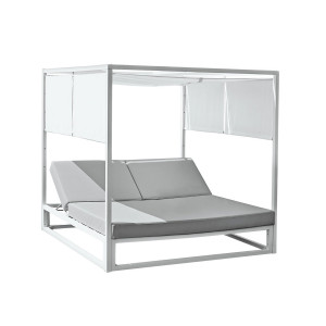 Vela Baldacchino con tende e Daybed by Vondom è il daybed outdoor con struttura a pergola dotata di un sistema di pensiline realizzato con profili in alluminio termo laccato. Soffitto in tessuto Roof Fabric e tende in tessuto Curtain Fabric. Articolo adatto per uso interno ed esterno. VELA è un sistema modulare con una geometria prismatica elementare che fonda la sua singolarità nell'equilibrio delle sue proporzioni. Gli elementi possono combinarsi tra loro per integrarsi in qualsiasi spazio. I loro volumi precisi creano l'illusione di librarsi a qualche centimetro dal pavimento e quando sono illuminati si trasformano in architetture fluttuanti. Versione base con materasso basic quadrato, disponibili come opzione i materassini reclinabili in 2 o 4 posizioni. MATERIALI