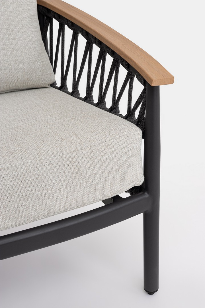 Divano 2 posti Fenix Antracite Bizzotto | Divano design da giardino in alluminio, braccioli in legno e tessuto Olefin