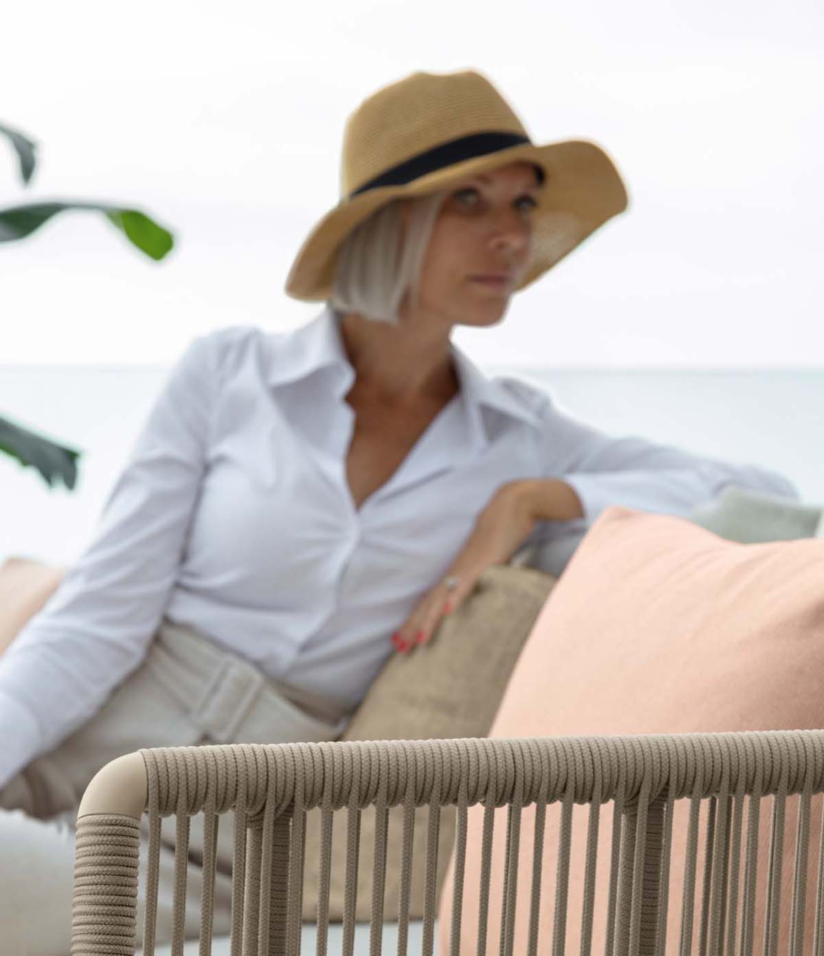 Ispirata alla modularità, la collezione Coral è caratterizzata da materiali quali alluminio e corda che impreziosiscono il prodotto e ne garantiscono la qualità nel tempo. Le linee pulite e le composizioni equilibrate della collezione sono arricchite da una serie di complementi che permettono un alto livello di utilizzabilità e confort. Il tema della corda è preponderante e lo si ritrova anche come dettaglio nelle impugnature delle sedute, nel side table o nei pouf.I divani sono caratterizzati da un volume solido sulla seduta, addolcita dai cuscini decorativi, in contrasto con le sedie e le sedute lounge la cui struttura esile e raffinata introduce il tema della leggerezza.
