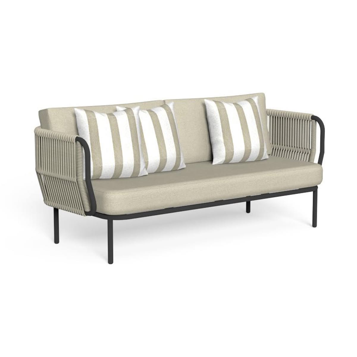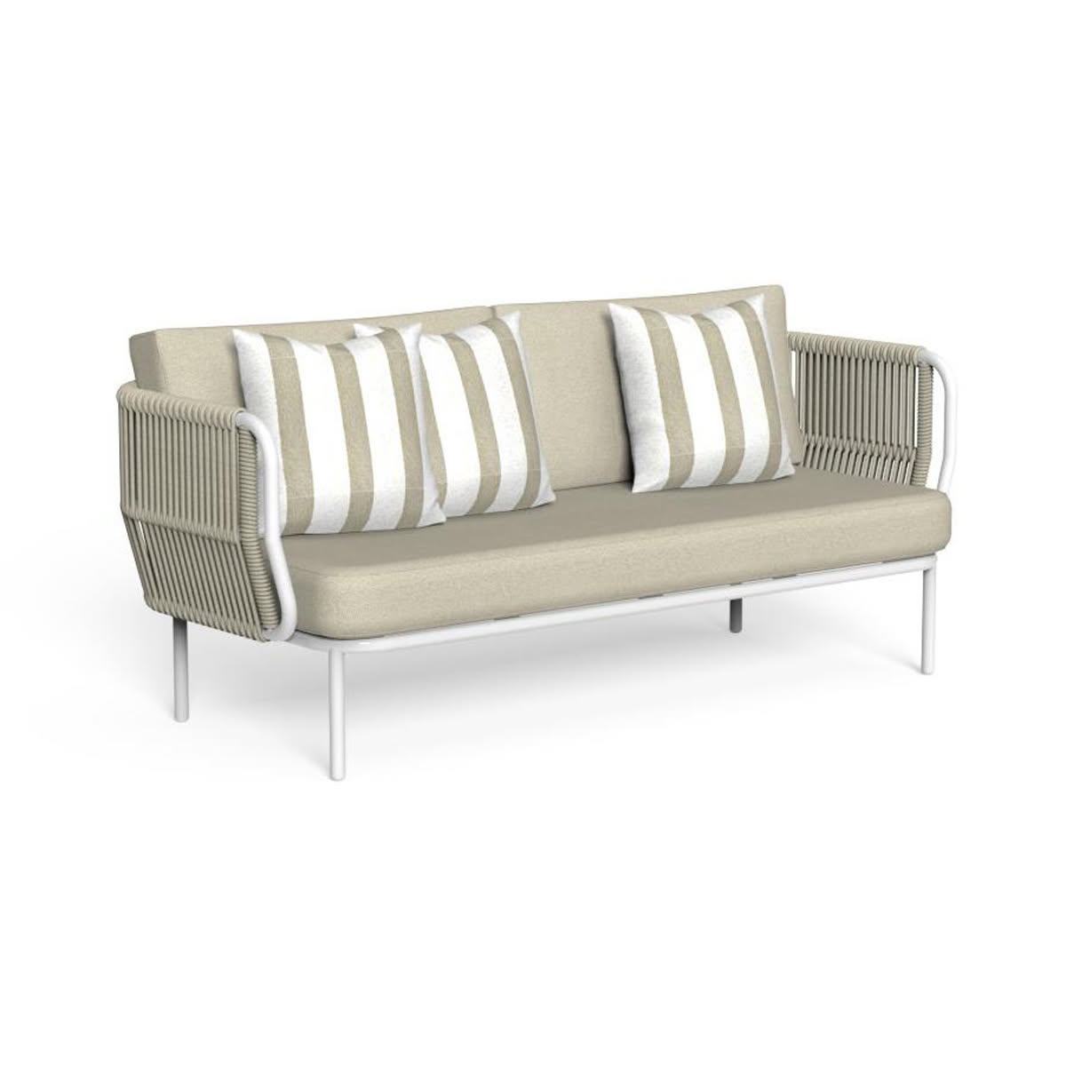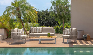 Plum Set da giardino di Talenti è il set da giardino caratterizzato da una struttura in alluminio verniciata in colore bianco (A12) o charcoal (A9). Cuscineria in nude (C198). Il Divano Plum è il cuore della collezione, un invito al relax più autentico. La struttura in alluminio verniciato e l’intreccio in corda sintetica dialogano con la morbidezza della cuscineria, creando una silhouette equilibrata e accogliente. Perfetto per terrazze, giardini e spazi lounge, interpreta con naturalezza l’eleganza contemporanea dell’outdoor. La Poltrona Living unisce struttura e morbidezza in un equilibrio perfetto. Il telaio in alluminio verniciato, leggero ma resistente, accoglie un intreccio in corda che avvolge la seduta con eleganza. I cuscini imbottiti, dalle linee essenziali e generose, garantiscono comfort e durabilità. Una poltrona pensata per il piacere di vivere all’aperto con stile e serenità. Il Tavolo da Caffè completa la collezione con un segno sobrio e funzionale. La struttura in alluminio verniciato sostiene un piano in legno naturale, caldo e materico, che aggiunge una nota di raffinatezza e convivialità. Equilibrato nelle proporzioni e versatile nel design, è il complemento ideale per comporre zone living outdoor dal carattere rilassato e armonioso.