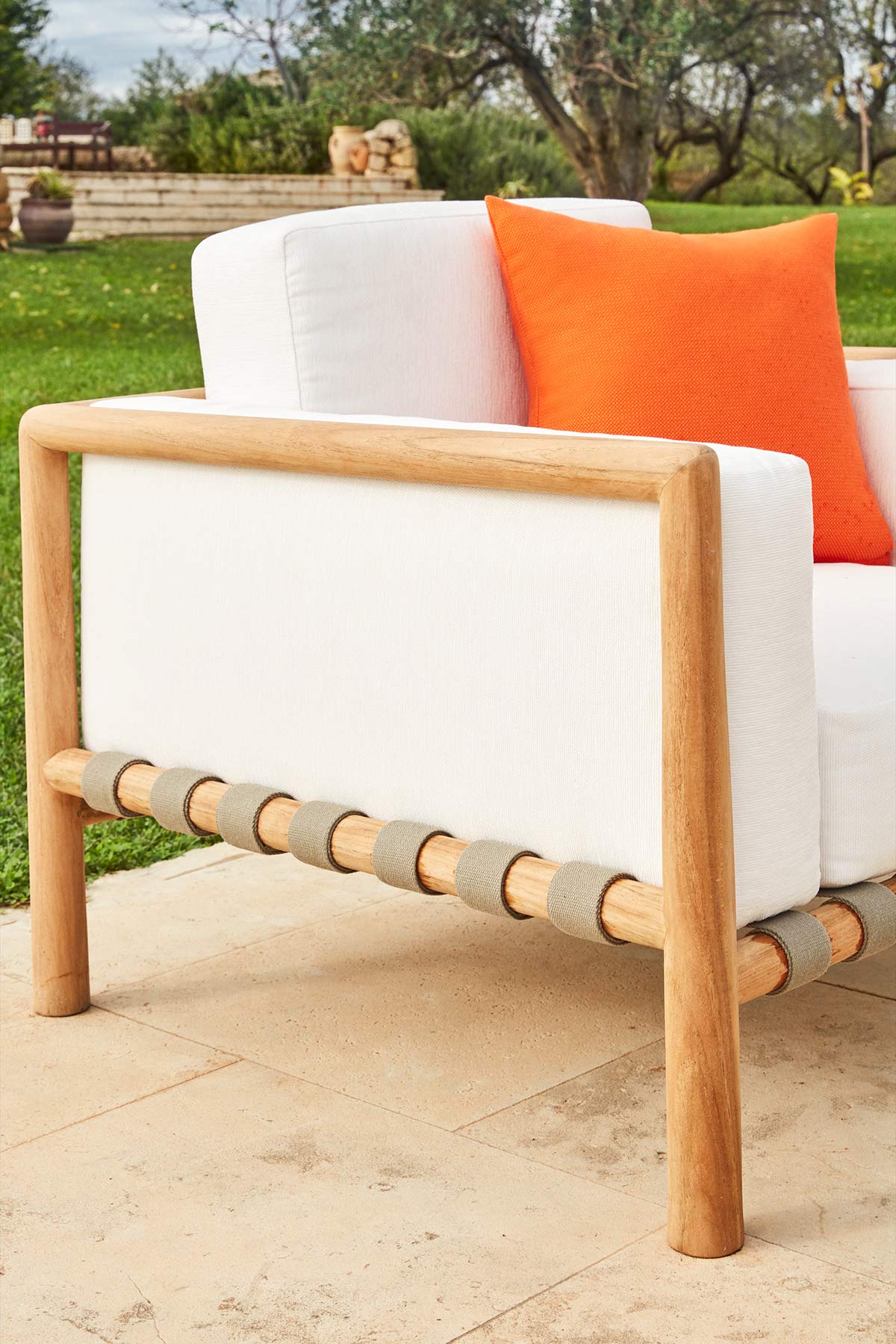 Il divano a 2 posti in teak Pevero nasce grazie alla sapiente cultura di Unopiù nella lavorazione del teak, materiale pregiato dalle ottime caratteristiche tecniche. La collezione ampia e versatile è caratterizzata da telai geometrici e lavorazioni ad incastro ispirate al mondo orientale, valorizzate dalla finitura naturale del legno che segue le linee e ne esalta i dettagli formali. Il cuscino della seduta e dello schienale in color latte sono inclusi e sono realizzati in tessuto acrilico sfoderabile. Pevero è perfetta per arredare ambienti contract ma anche eleganti aree private come giardini e terrazze. Cover in tessuto verde e cuscini arredo quadrati disponibili su richiesta.