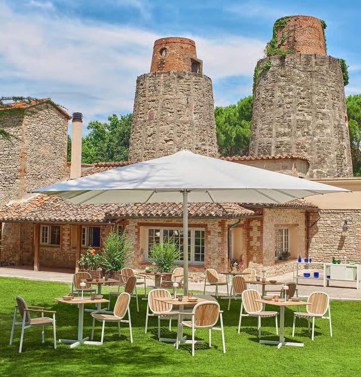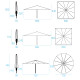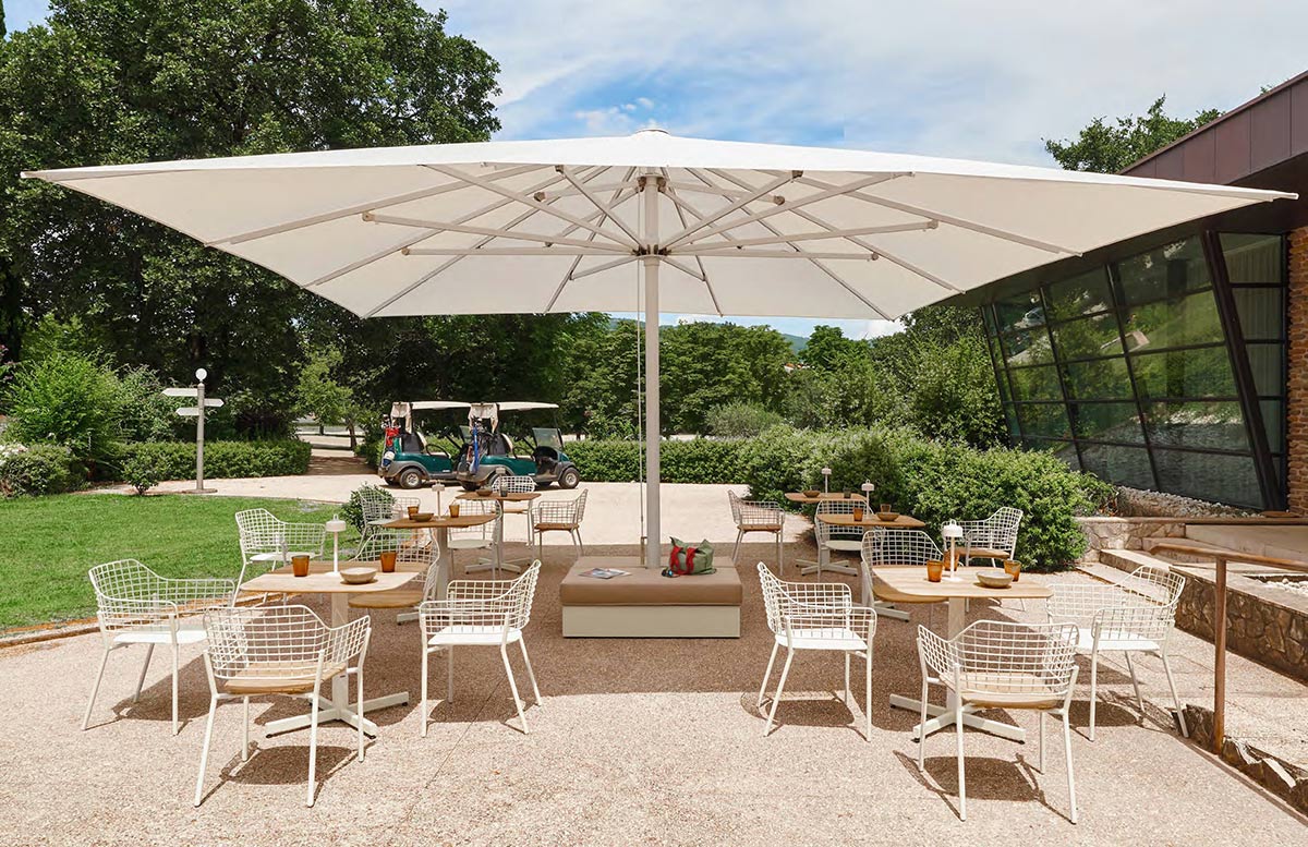 Maggiore è un ombrellone a palo centrale disponibile nelle dimensioni quadrate 5x5, 6x6 o nella dimensione tonda Ø7 metri che consentono una copertura di spazi da 25 a 50 metri quadrati. La sua ampiezza è ideale per l’utilizzo contract poiché consente una mise en place di numerosi tavoli e sedute, a cui si aggiunge la confortevole seduta dining del basamento con cuscino. A renderlo perfetto per il mondo dell’ospitalità è, inoltre, l’estrema facilità e immediatezza del meccanismo di apertura e chiusura grazie a delle leve interne appositamente ideate e progettate. L’ombrellone si completa di luci led dimmerabili, sistema antivento e snodi in alluminio dal design tecnologico