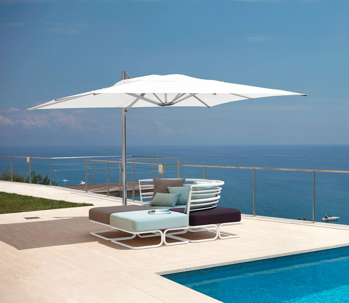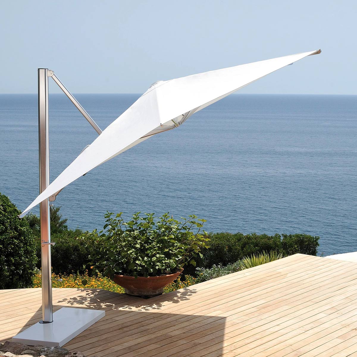 Navona 4x3 è l'ombrellone da giardino a palo laterale dall'ampia superficie ombreggiante per accogliere pranzi e cene all'aperto offrendo ristoro dalle calde giornate estive e protezione dall'umidità serale. Un ombrellone elegante, minimal e funzionale per ogni spazio all'aperto o semi coperto. La collezione Navona, best seller di EMU, è una famiglia di coperture da esterni realizzata dal Centro Ricerche EMU in collaborazione con il designer francese Christophe Pillet. È un progetto ampio e ambizioso, frutto di un’eccezionale ricerca tecnologica, in grado di sviluppare un sistema di equilibri e leve che facilitano in modo straordinario le fasi di apertura e chiusura. Materiali tecnologici e design accattivante per prodotti eleganti e rifiniti, ideali per portici e verande residenziali. Qualità, resistenza e bellezza, fanno di questi ombrelloni gli accessori perfetti per completare l’arredamento degli spazi all'aperto, anche in situazioni Contract. Disponibile su richiesta anche con tessuto Acrilico.