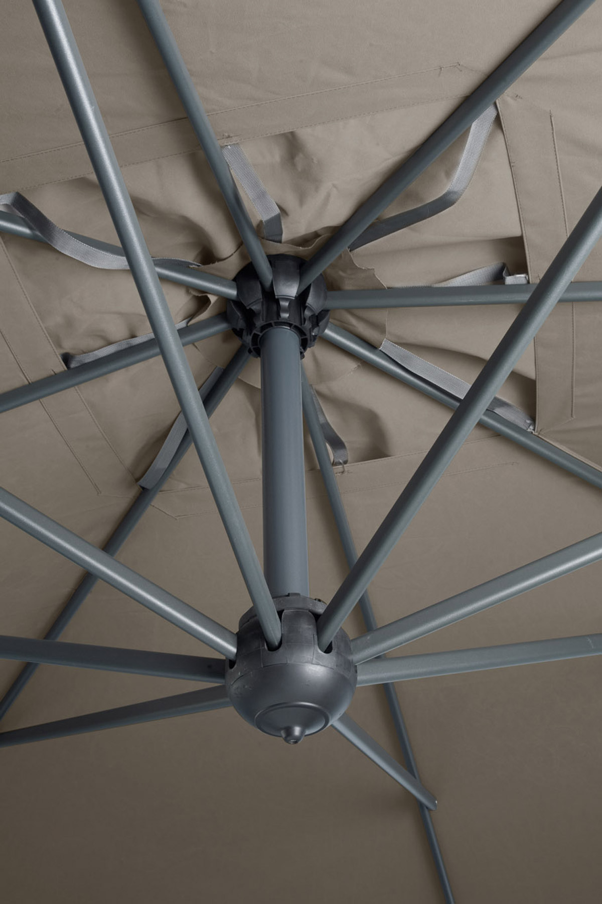 Interamente in alluminio e acciaio verniciati a polveri colore grigio antracite. Sostegno verticale sezione 82x82 mm. Stecche in alluminio sezione 18x30 mm, facilmente intercambiabili abbinate a corone in plastica brevettate per aumentare la resistenza e durata, semplificare la manutenzione e migliorare il design. Con aggancio singolo dedicato per ogni stecca. Sistema di apertura retrattile che permette la chiusura vicino al sostegno verticale evitando di dover spostare i mobili sottostanti. Possibilità di inclinazione oltre il 60°C. Con la base girevole l’ombrellone può essere orientato in maniera ottimale in ogni momento della giornata. Tutti gli accessori sono zincati antiruggine e verniciati a polveri colore antracite. Viteria in acciaio inox. Apertura e chiusura con meccanismo a manovella. Stecca blocco antivento per rendere l’ombrellone più stabile e resistente in caso di vento e con possibilità di inclinazione. Inclusa base in metallo girevole 360°C.