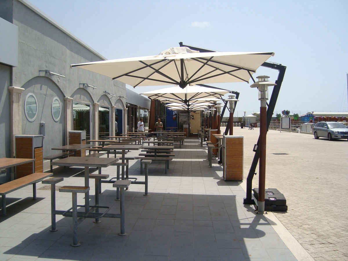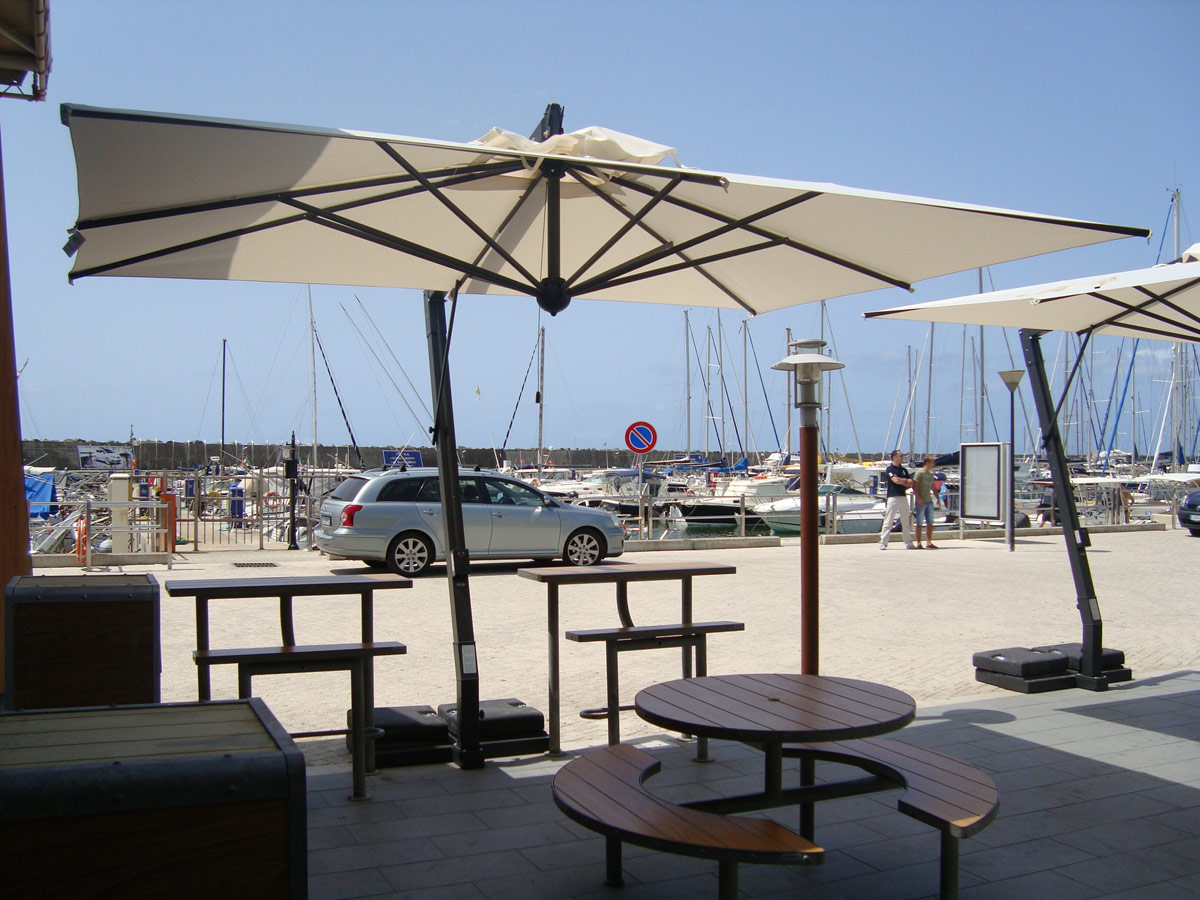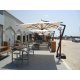 Interamente in alluminio e acciaio verniciati a polveri colore antracite. Sostegno verticale sez. 75x75 mm. Stecche in alluminio sezione 18x30 mm, facilmente intercambiabili abbinate a corone in plastica brevettate per aumentare la resistenza e durata, semplificare la manutenzione e migliorare il design. Con aggancio singolo dedicato per ogni stecca. Tutti gli accessori sono zincati antiruggine e verniciati a polveri colore bianco . Viteria in acciaio inox. Apertura e chiusura con meccanismo a manovella. Stecca blocco antivento per rendere l’ombrellone più stabile e resistente in caso di vento e con possibilità di inclinazione. Inclusa base in metallo girevole 360°C.
