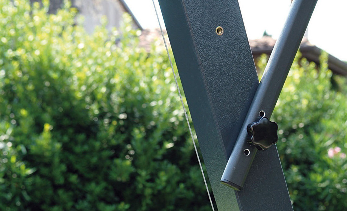 Le parti in acciaio, la viteria e gli accessori sono zincati antiruggine. Per garantire e assicurare una maggiore durata del prodotto è consigliabile comunque porre l’ombrellone e la base al riparo durante i mesi invernali o durante i periodi di non utilizzo. Durante ogni stagione verificare periodicamente lo stato e la funzionalità dei componenti soprattutto dopo un periodo lungo dove l’ombrellone non sia stato utilizzato.