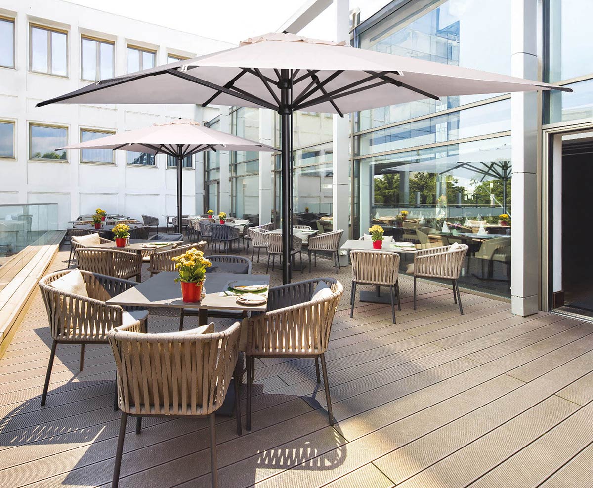 Verona Dark 3,5x3,5 by Scolaro Ombrelloni Parasol è l'ombrellone da giardino riprende il pratico ed apprezzato sistema di apertura e chiusura telescopico, tramite asta, del Capri. È stato progettato reinterpretando la robustezza della struttura alle misure proposte ed è dotato di un palo diametro 80 mm. Le innovazioni sui componenti utilizzati ne facilitano l’utilizzo, rendendolo ideale per un impiego professionale in ambienti contract come dehor di hotel, ristoranti e bar. Pensato per rispondere alle esigenze del settore HoReCa, unisce affidabilità, praticità e un design contemporaneo, assicurando massima resistenza e durata nel tempo. Interamente in alluminio e acciaio verniciati a polveri colore nero opaco. Palo diametro 80 mm. Stecche intercambiabili 20x40 mm. Viteria in acciaio inox. Pratica apertura a bilanciere applicata al sistema telescopico per la chiusura al di sopra di tavoli e sedie. Base a croce metallica inclusa