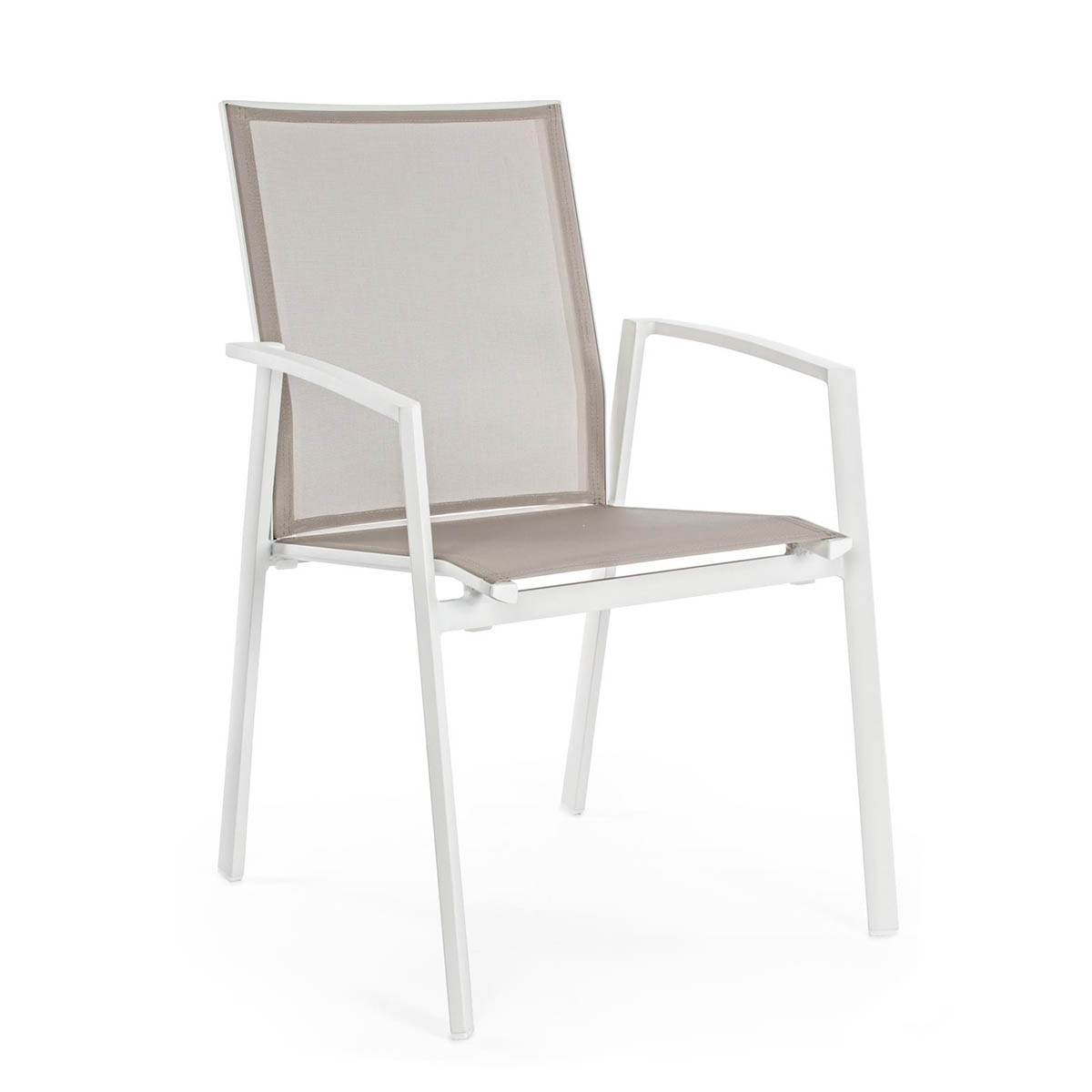 Sedia con braccioli Cruise bianco di Bizzotto è una poltroncina da giardino impilabile con struttura in alluminio verniciato a polvere (poliestere), seduta e schienale rivestiti in textilene phifer 1x1 perfetta da abbinare al tuo tavolo da pranzo all'aperto.