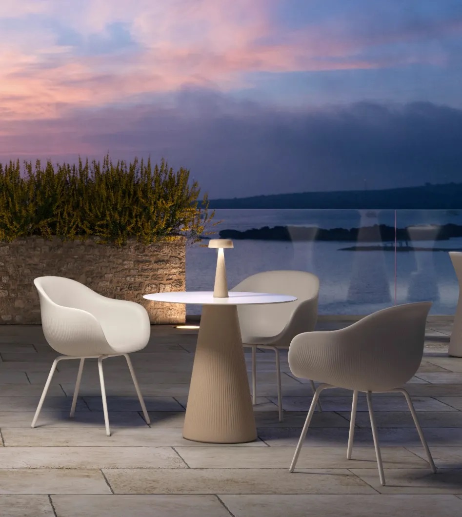 Fade chair è la poltroncina da esterno confortevole dalla singolare superficie rigata con particolari finiture che ricordano materiali naturali. Le gambe sono in metallo verniciato coordinato oppure in metallo verniciato nero. La sua ricercata composizione di colore e materia esprime la bellezza senza tempo della pietra scolpita, inoltre l’elegante rigatura sfumata ne esalta la forma, enfatizzandone la superficie in un gioco di luci ed ombre.