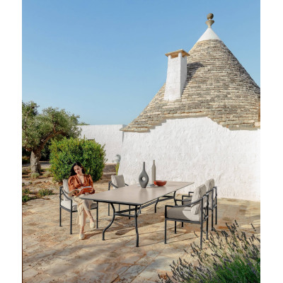 Uno stilema classico che assume una visione contemporanea. Capri è una collezione che reinterpreta lo stile degli eleganti bagni all’italiana, quelli che dalla costiera amalfitana al lido di Venezia hanno segnato l’estate da cinema degli anni 50 e 60. Una leggerissima lavorazione in alluminio che interpreta senza citarla direttamente, la classicità. Il duo artistico Ludovica Serafini+Roberto Palomba affronta il tema della lavorazione artigianale “del ferro battuto” , realizzando un prodotto dal design trasversale in grado di arricchire ambienti dai richiami neoclassici, o entrare in contesti estremamente moderni in maniera iconica e sofisticata. L’opulenza della natura e gli scorci pieni di fascino dei paesaggi mediterranei sono le ispirazioni che hanno dato origine alle collezioni del catalogo Premium. Una selezione di arredi per la vita outdoor che fanno della qualità e dell’eleganza le loro parole chiave. Raccontano momenti di benessere legati alla dolce vita italiana con eleganza e raffinatezza. Il design eccellente dei prodotti proposti è espresso nella ricercatezza delle finiture, nella scelta di cromatismi caldi e materici, nell’esperienza manifatturiera che crea prodotti resistenti e sempre ricchi di fascino. Divani e sedute destinati al relax, tavoli e sedie che scaldano e rendono piacevoli le zone dining: le collezioni del catalogo Premium reinterpretano il concetto di vita all’aperto, trasformando gli ambienti in conviviali oasi di pace.