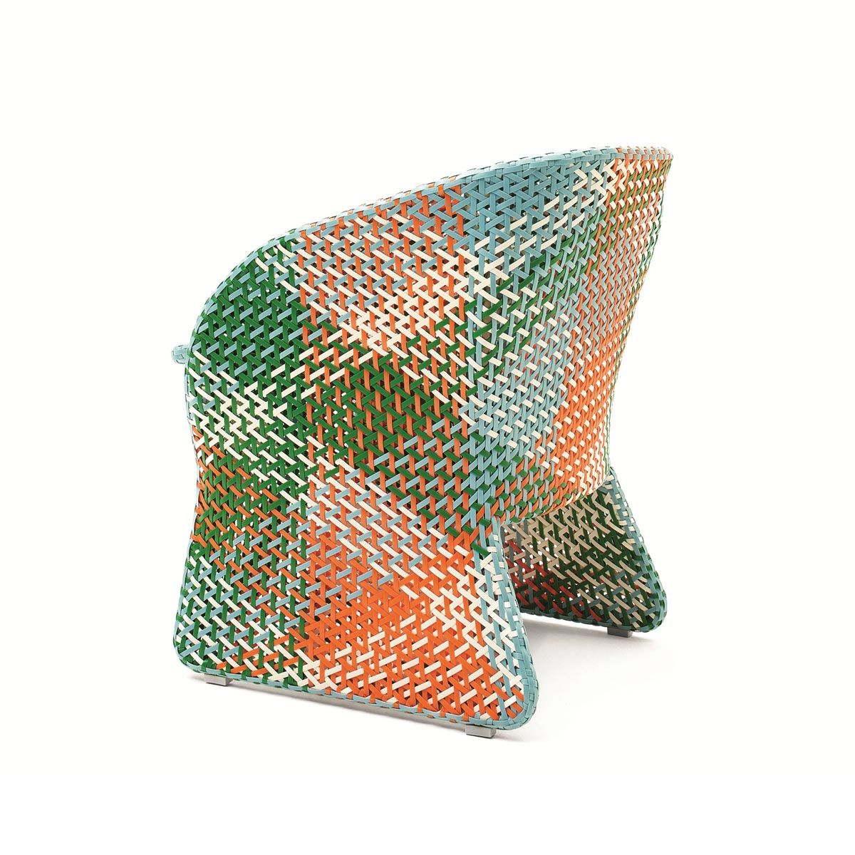 MAAT è il nome di una collezione di cui fanno parte poltrona lounge e poltroncina caratterizzate da un design morbido, espresso in volumi modellati in modo sinuoso e avvolgente. Segno dominante, l’intreccio a trama larga in fibra sintetica, eseguito a mano secondo un pattern decorativo di gusto geometrico.