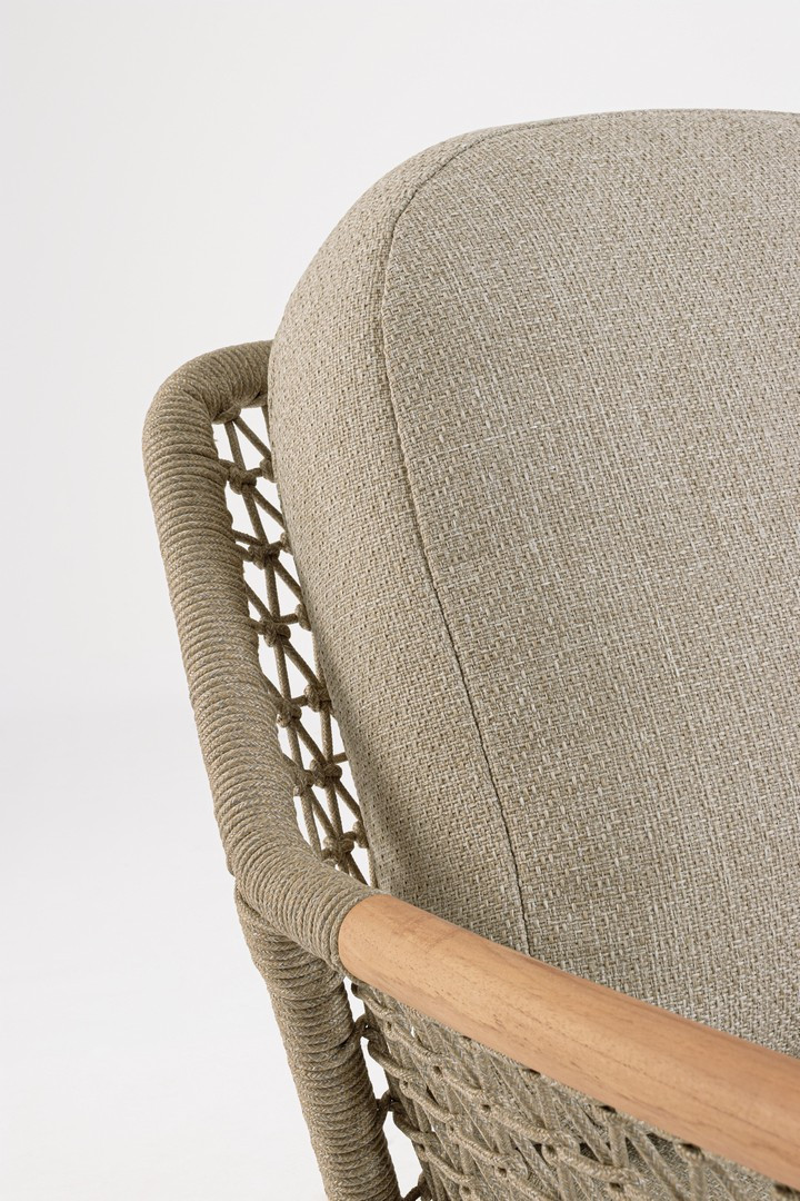 Prodotto destinato solo per uso domestico. Struttura in alluminio verniciata a polvere (poliestere).Braccioli con inserti in teak. Seduta con intreccio in corda olefin. Cuscini sfoderabili con tessuto idrorepellente olefin (100% polipropilene). Viteria in acciaio inossidabile. Non salire in posizione eretta. L’articolo è concepito per l’utilizzo di una sola persona (se poltrona), tre persone (se divano>. Dove possibile, si consiglia di girare i cuscini regolarmente per uniformare le variazioni di colore che possono presentarsi nel tempo causa lunga esposizione ai raggi solari.