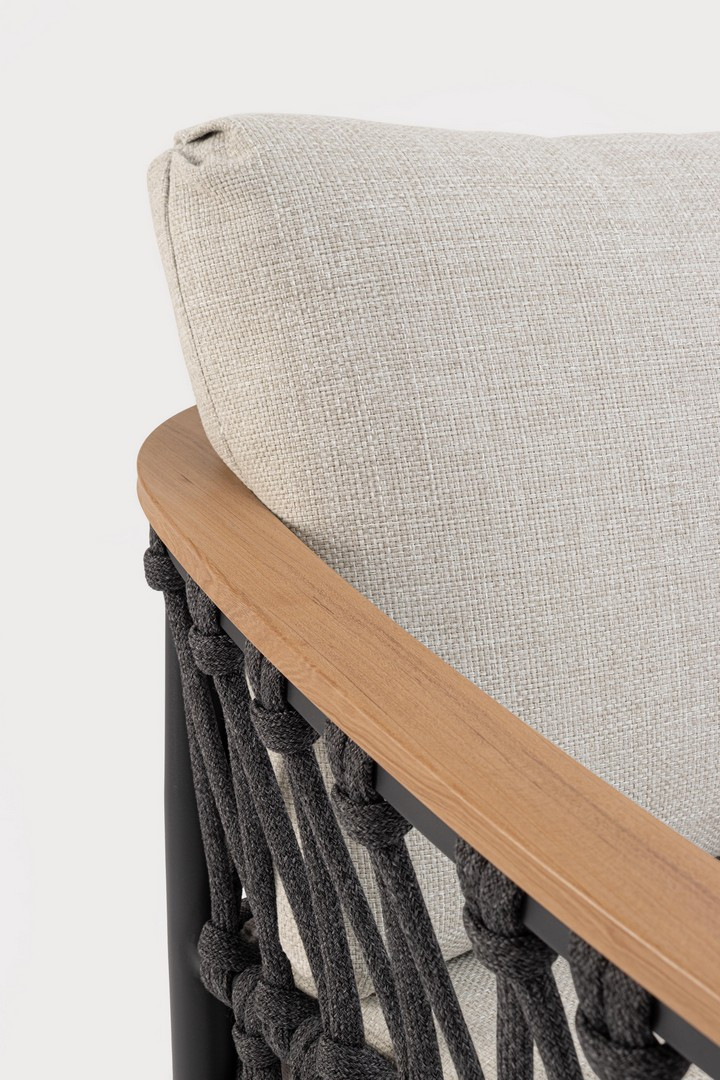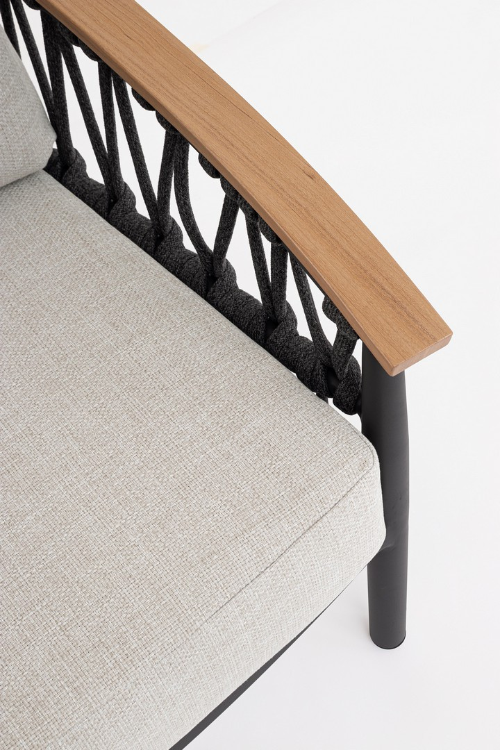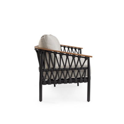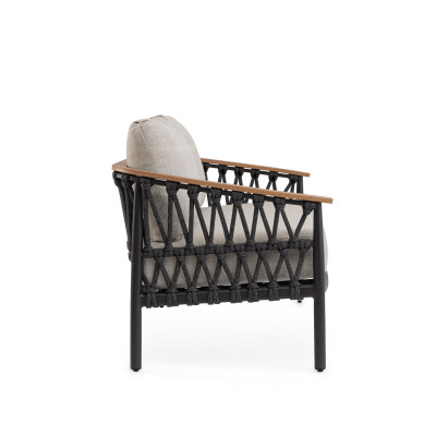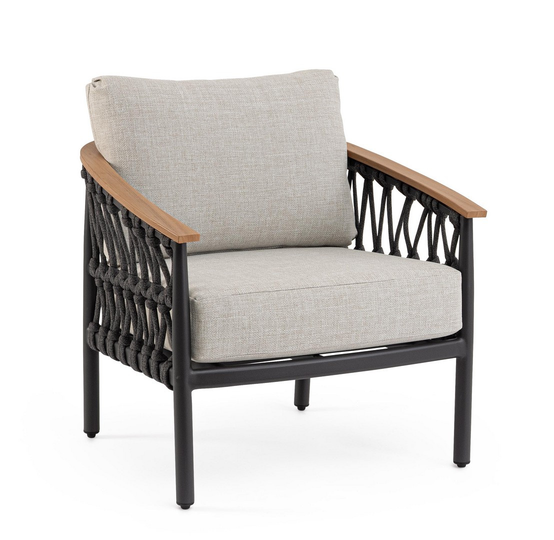 Poltrona Fenix Antracite di Bizzotto è la poltrona da giardino in alluminio verniciato a polvere (poliestere). Braccioli in alluminio con verniciatura effetto legno ed intreccio con corde in tessuto olefin (100% polipropilene). Cuscini seduta e schienale sfoderabili con tessuto idrorepellente olefin (100% polipropilene). Piedini regolabili.