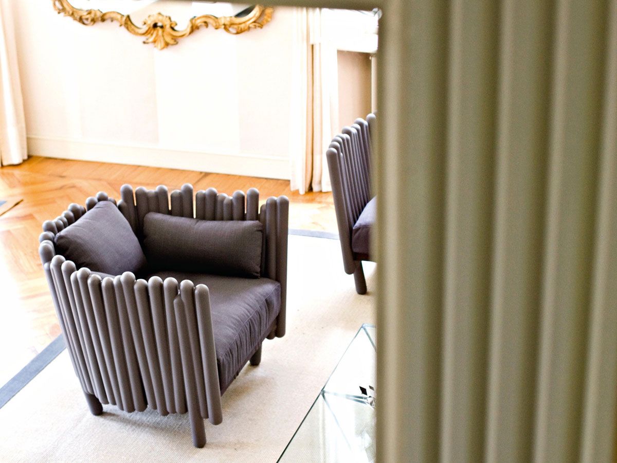 "Sulle rive del Mediterraneo crescono giunchi, piante selvatiche con lunghe aste flessibili, che oscillano al vento, resistendo. Queste piante sottili vengono raccolte e legate per realizzare graticci utilizzati per proteggersi dal sole, dal vento, dagli sguardi. Queste "cannes de Provence", trasformate in separazioni, "les canisses", sono evocate in questo progetto di sedute per l'esterno, prendendone in prestito l'estetica semplice e irregolare. Come un recinto costituito da un accumulo di aste solidali tra di loro, la struttura si sviluppa in una linea mobili moderni, di divani componibili e poltrone." Philippe Nigro