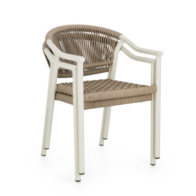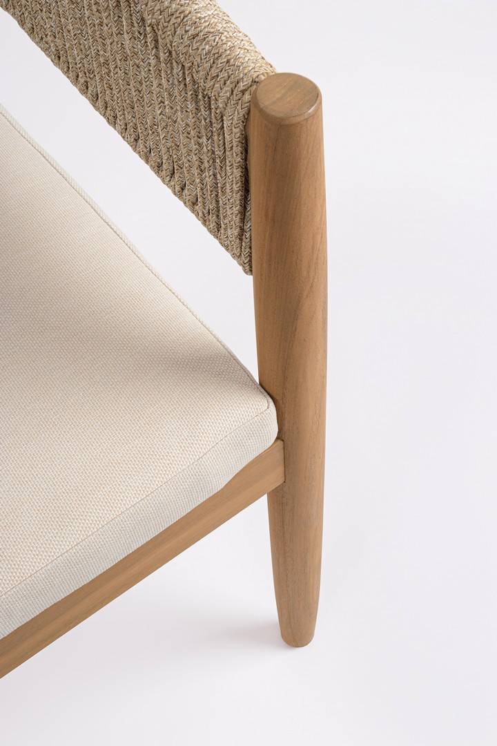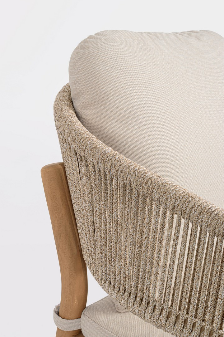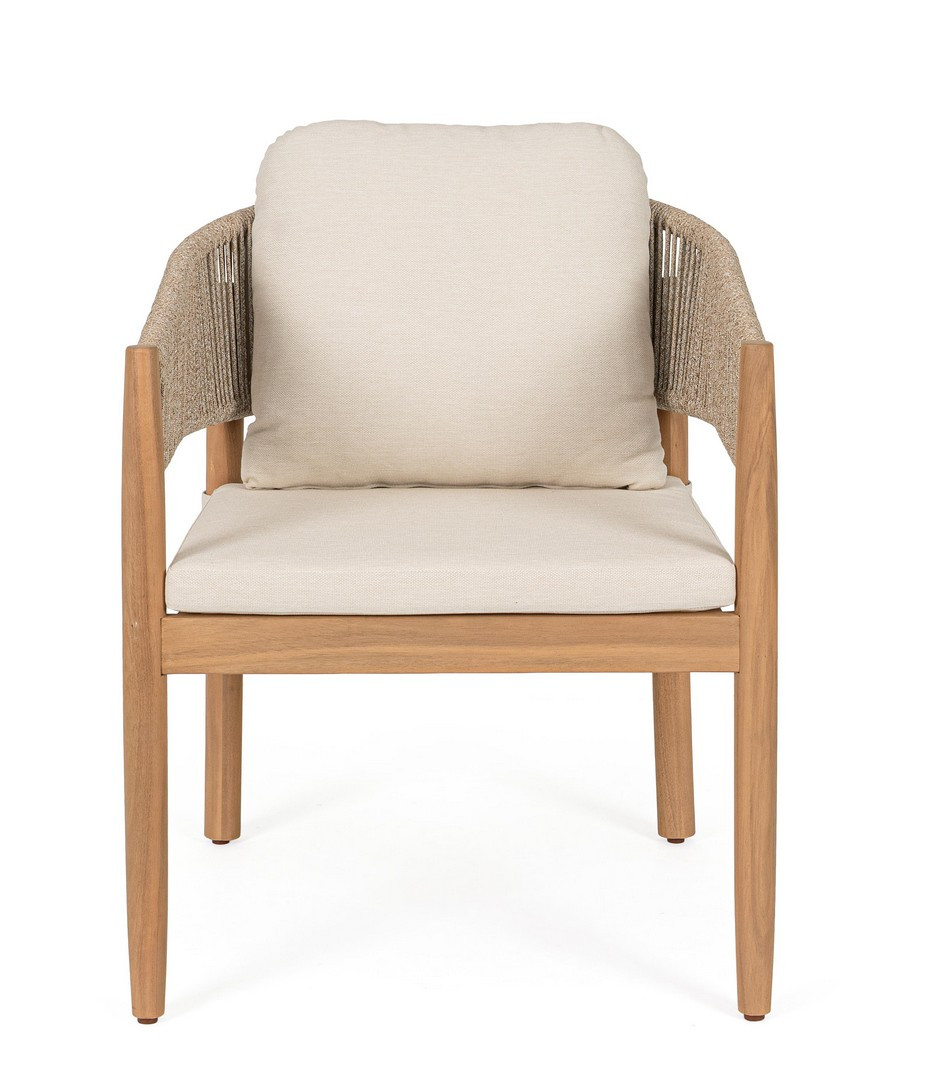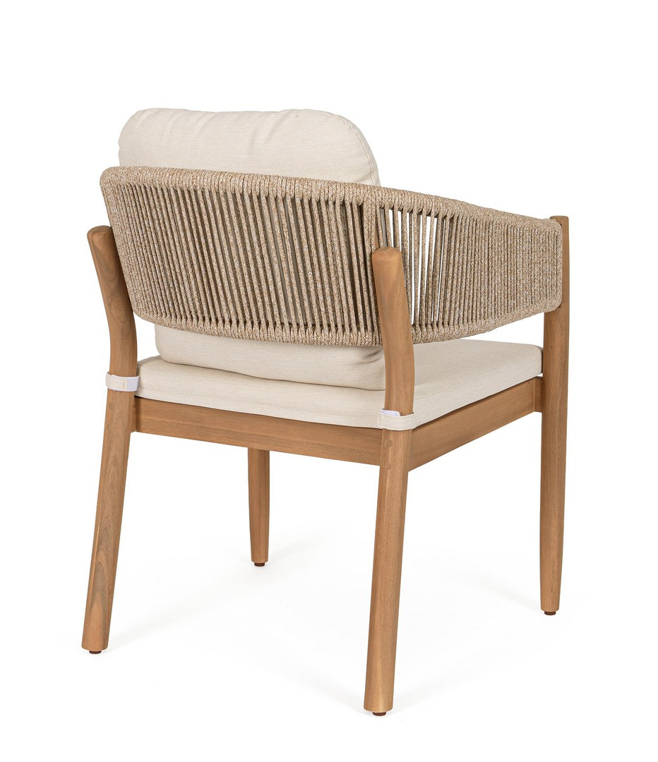 Sedia con braccioli Thiago di Bizzotto è la poltroncina di design con struttura in legno di acacia fsc 100%, finitura a olio (effetto teak). Schienale in alluminio con intreccio in corda (poliestere). Cuscino sfoderabile in tessuto idrorepellente olefin (100% polipropilene). Piedini regolabili.