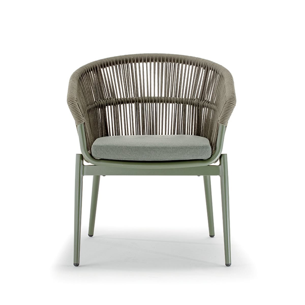Tropea Armchair Grattoni è la poltroncina da giardino di design con struttura in alluminio e rivestimento in corda textilene. Cuscineria sfoderabile con tessuto Olefin e gomma drenante QDF.