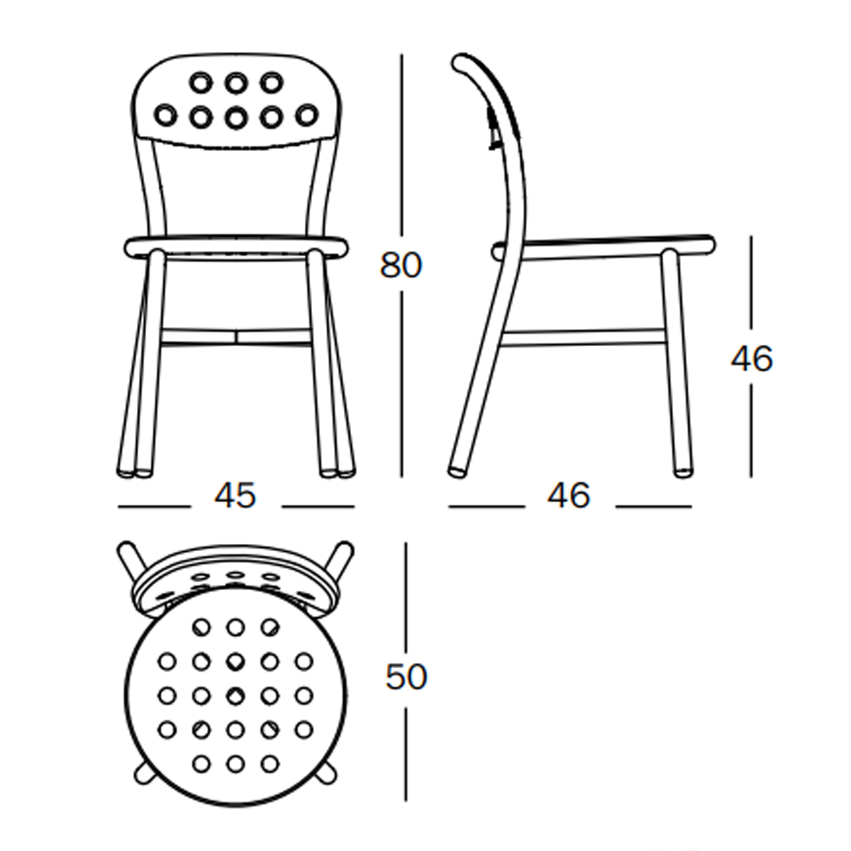 Materiali: struttura in tubo di alluminio verniciato poliestere. Sedile e schienale in lamiera di alluminio forata verniciata poliestere. Adatta anche per esterno.
