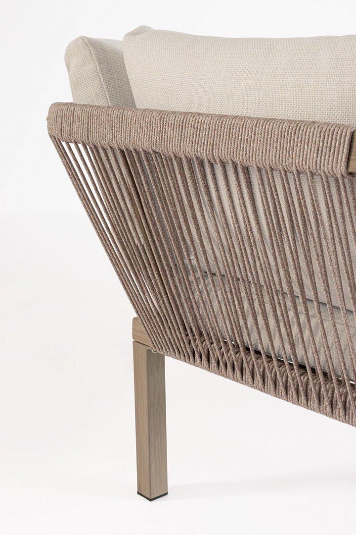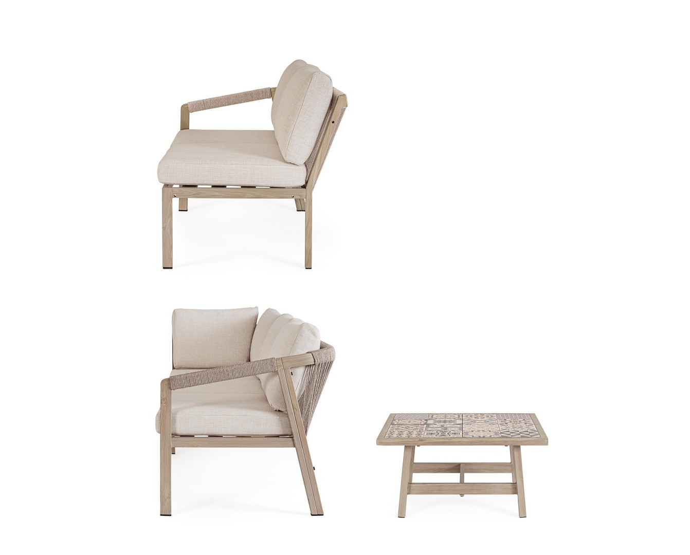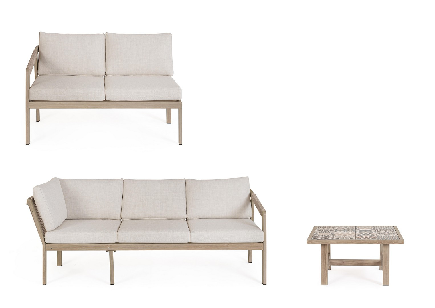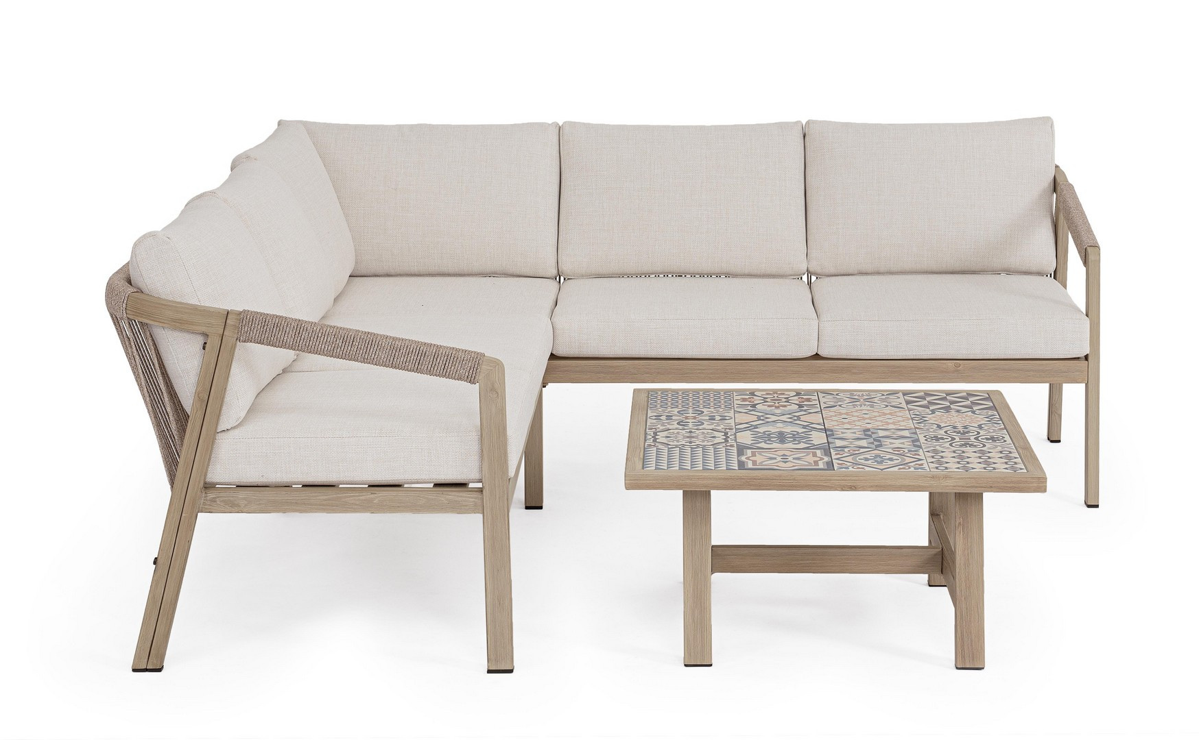 Set salotto angolare Kalimera Timber di Bizzotto è il set da giardino in alluminio verniciato a polvere (poliestere) effetto legno. Piano tavolino con mattonelle in porcellana smaltata (provenienza spagna). Schienale e braccioli con intreccio in corda di poliestere (tonda 5mm). Cuscini seduta e schienale sfoderabili con tessuto idrorepellente olefin (100% polipropilene). Viteria in acciaio inossidabile. Da assemblare.