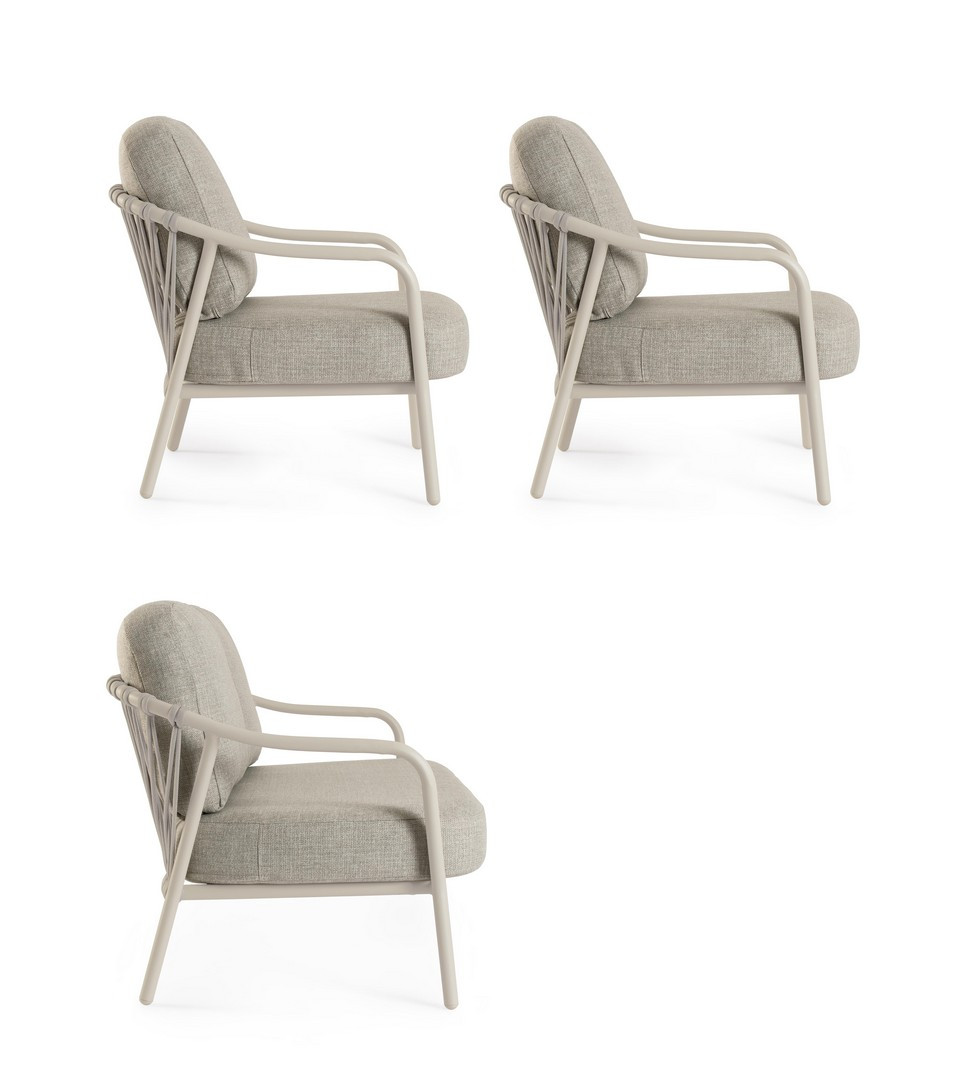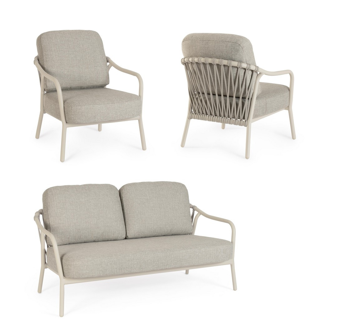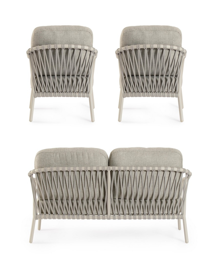 Set3 Salotto Edvige Pelican di Bizzotto è il set da giardino di design con struttura in alluminio verniciata a polvere (poliestere). Schienali con intreccio in corda olefin. Cuscini sfoderabili con tessuto idrorepellente olefin (100% polipropilene).
