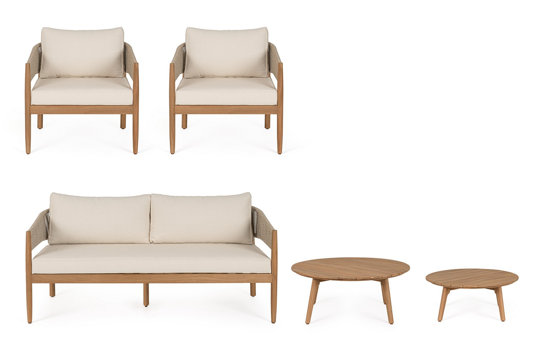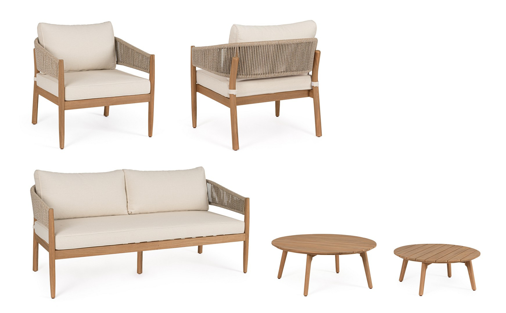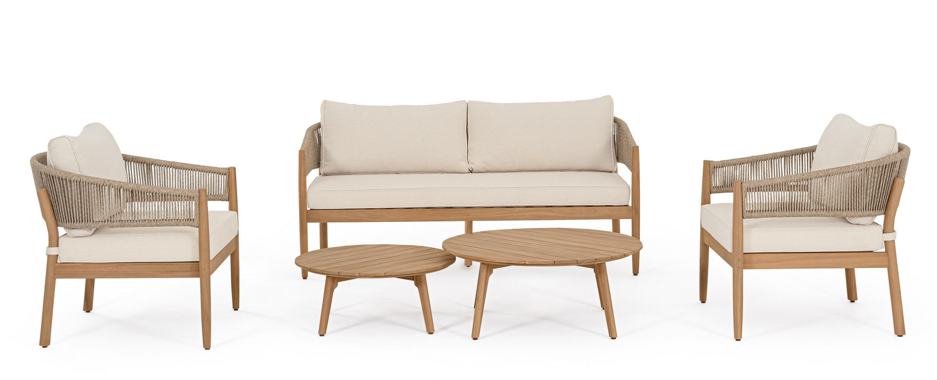 Set5 Salotto Thiago di Bizzotto è il set da giardino di design con struttura in legno di acacia fsc 100%, finitura a olio (effetto teak). Schienale in alluminio con intreccio in corda (poliestere). Cuscini sfoderabili in tessuto idrorepellente olefin (100% polipropilene). Viteria galvanizzata. Piedini regolabili tavolini con gambe da assemblare.