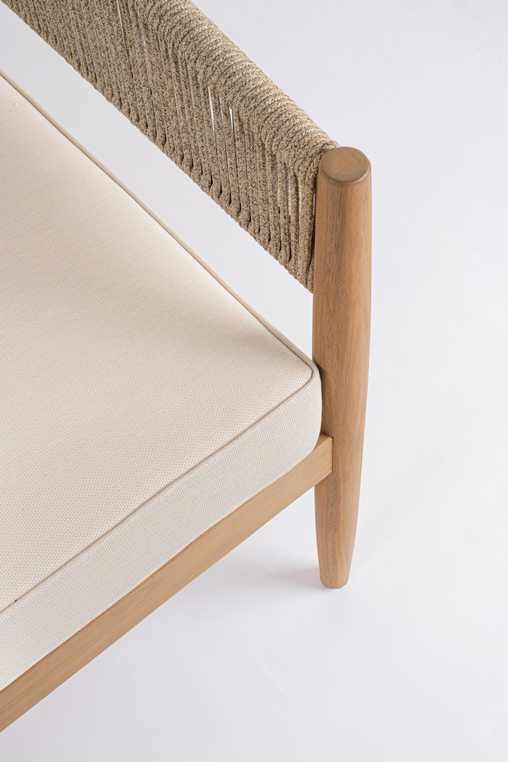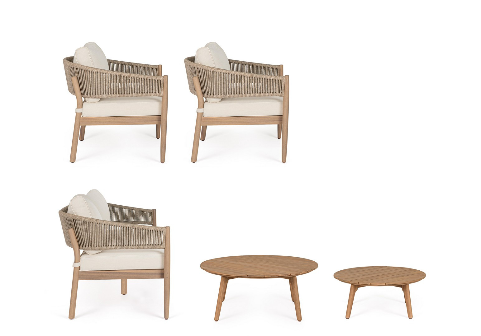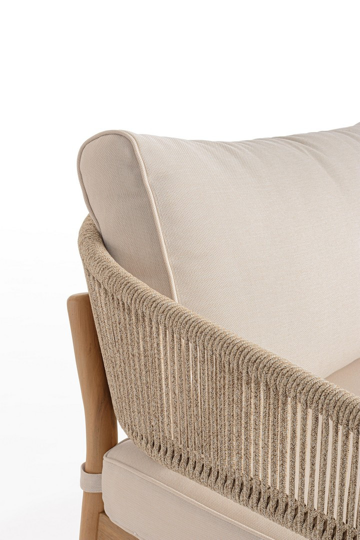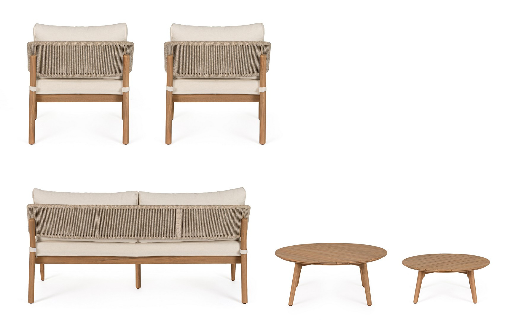 Set5 Salotto Thiago di Bizzotto è il set da giardino di design con struttura in legno di acacia fsc 100%, finitura a olio (effetto teak). Schienale in alluminio con intreccio in corda (poliestere). Cuscini sfoderabili in tessuto idrorepellente olefin (100% polipropilene). Viteria galvanizzata. Piedini regolabili tavolini con gambe da assemblare.