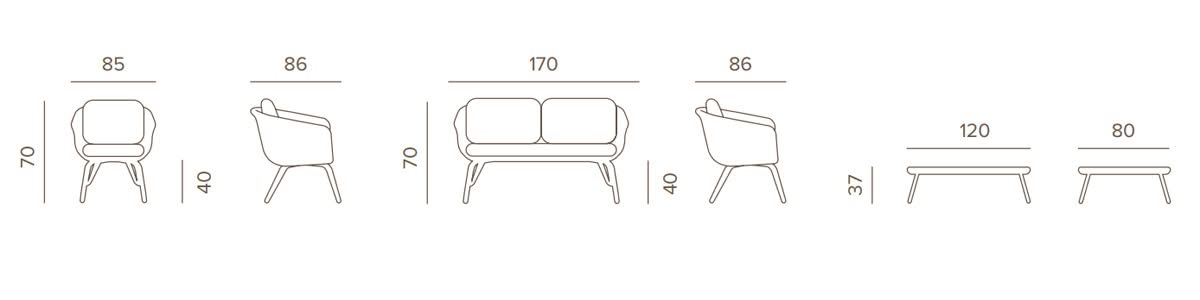 Melrose Rope Set Grattoni è il set da giardino di design coordinato composto da un divano 2 posti, due poltrone e 1 tavolino con piano in lamiera di alluminio. Struttura in alluminio e rivestimento con corda textilene.