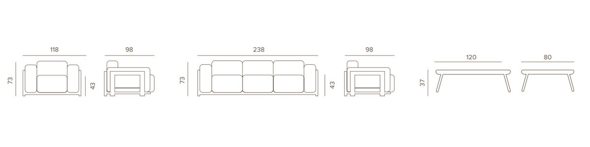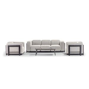 Rule Alu Set Grattoni è il set da giardino di design coordinato composto da divano tre posti, due poltrone e tavolino in alluminio. Struttura in alluminio e gomma drenante “quick dry foam” e rivestimento in tessuto acrilico. Adatto ad un uso esterno.