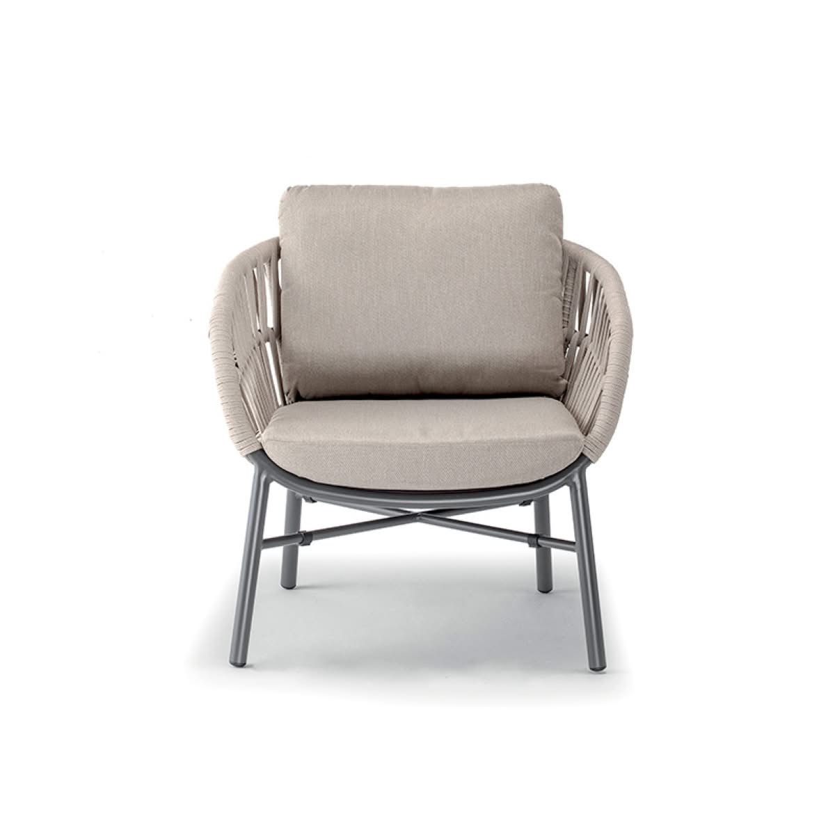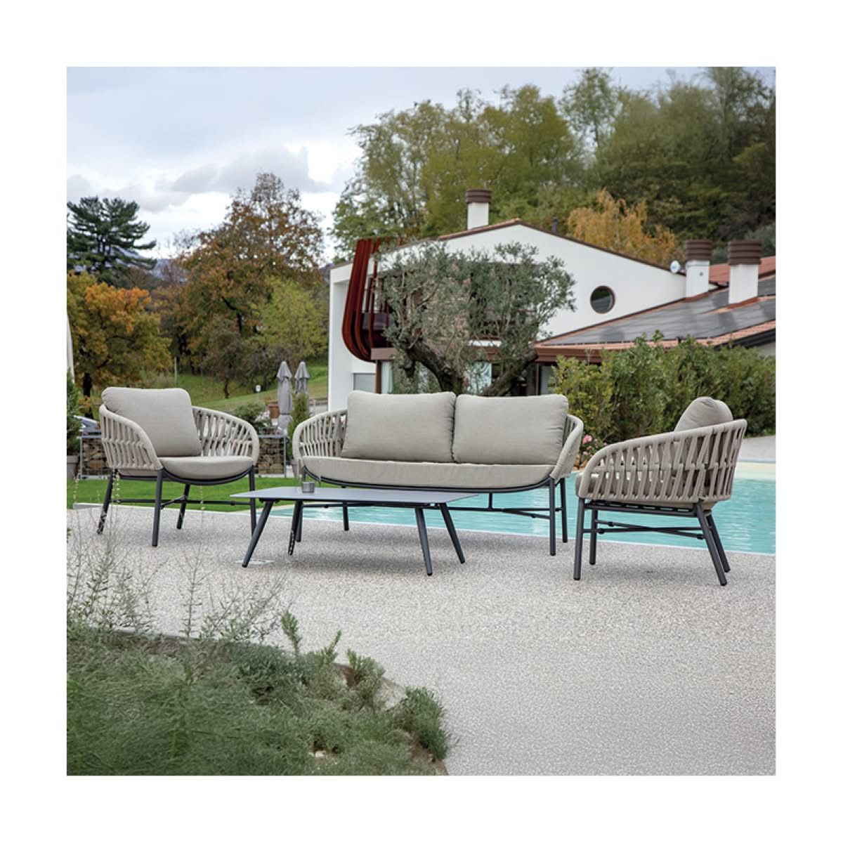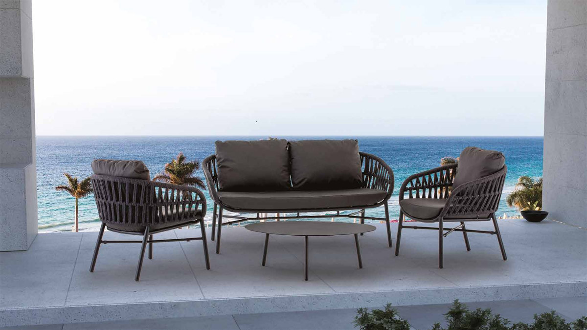 Tahiti Set Grattoni è il set da giardino di design coordinato con struttura in alluminio e rivestimento in corda poliestere Ø 6 mm, composto da due poltrone, un divano 2 posti o 3 posti e un tavolino con piano in alluminio. Con le sue forme avvolgenti e gli intrecci raffinati, il coordinato Tahiti racconta un’eleganza senza tempo, trasformando ogni spazio esterno in un rifugio caldo e sofisticato dove lasciarsi cullare dalla bellezza.