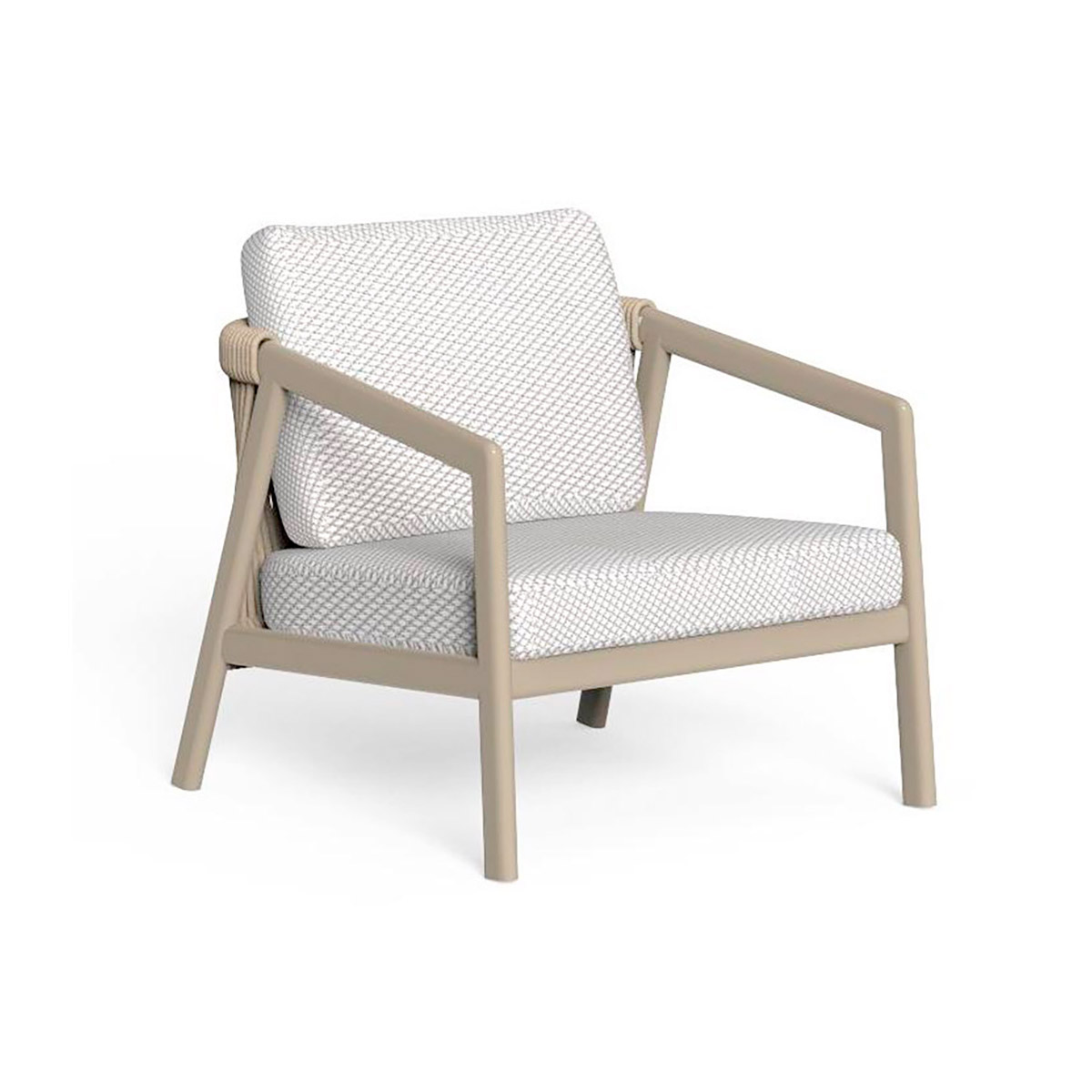 Tutti gli articoli sono caratterizzati da una struttura di base in alluminio verniciato a polvere in colore Tortora (A13) o charcoal (A9), mentre gli schienali, anch’essi costituiti da una struttura interna in alluminio sono rivestiti da una corda sintetica in tinta al colore della seduta: beige (R46) o grey (R47). Cuscineria sfoderabile, imbottitura realizzata in quick dry foam e rivestita con tessuti studiati per l’outdoor è disponibile nelle colorazioni; bianco-beige (C62) sulla struttura tortora e carbon (C63) sulla struttura charcoal.