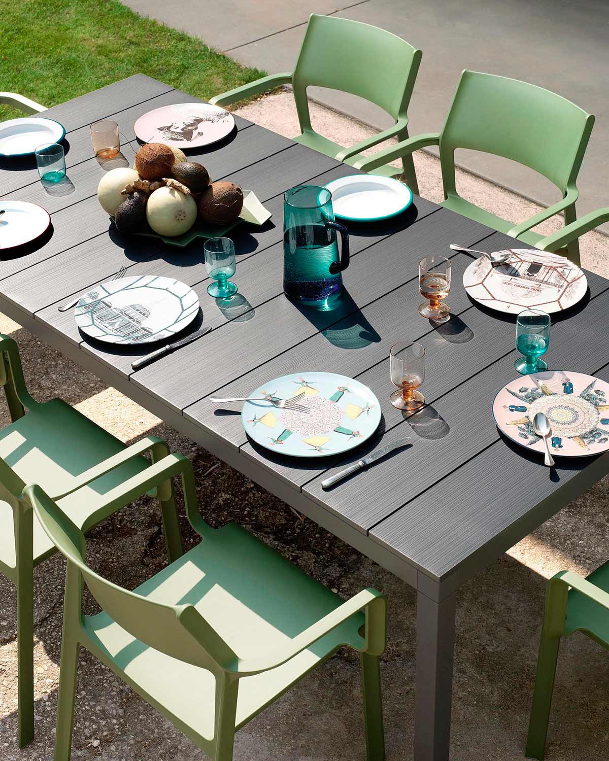 Il set tavolo Rio 140 con 8 sedie Trill Bistrot è il nuovo set da giardino firmato NARDI per il tuo spazio outdoor. Composto da 1 tavolo Rio da 140 cm allungabile fino a 210 cm e 8 sedie Trill Bistrot. Il tavolo è realizzato in polipropilene trattato anti-UV e colorato in massa, gambe in alluminio verniciato con piedini regolabili e piano in DurelTOP en pendant cromatico con la struttura. Nuovo sistema di stipaggio delle allunghe al di sotto del piano per il massimo della praticità di utilizzo. La sedia impilabile Trill è ispirata ai linguaggi formali tipici dei materiali come il metallo e il legno, amalgamando abilmente entrambe le ispirazioni attraverso ricercate e inattese soluzioni arrotondate di raccordo. A rendere ancor più accattivante questa comodissima sedia sono i nuovissimi colori disponibili agave, ottanio e tabacco che si aggiungono agli classici colori bianco, antracite, tortora, senape. Scegli il tuo allestimento preferito, scegli la qualità, scegli il design Made in Italy!