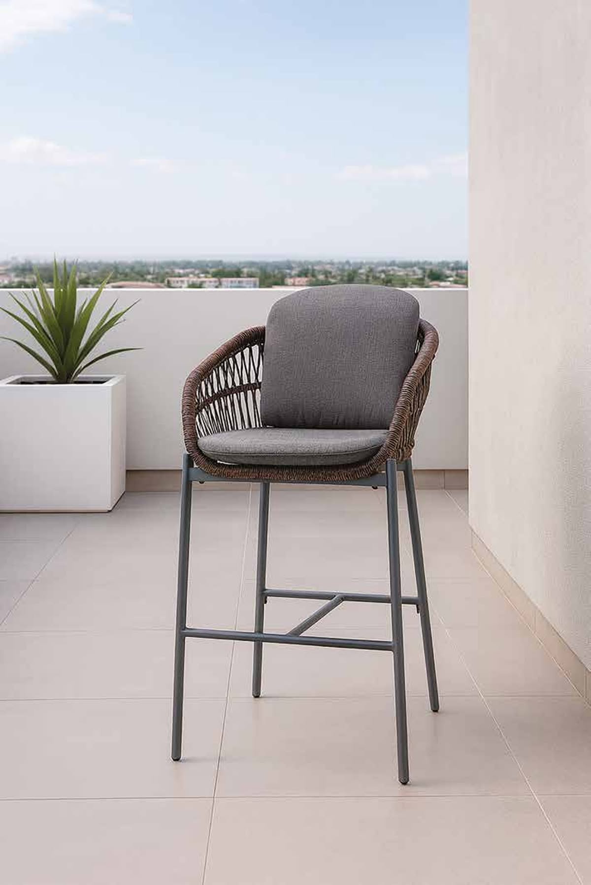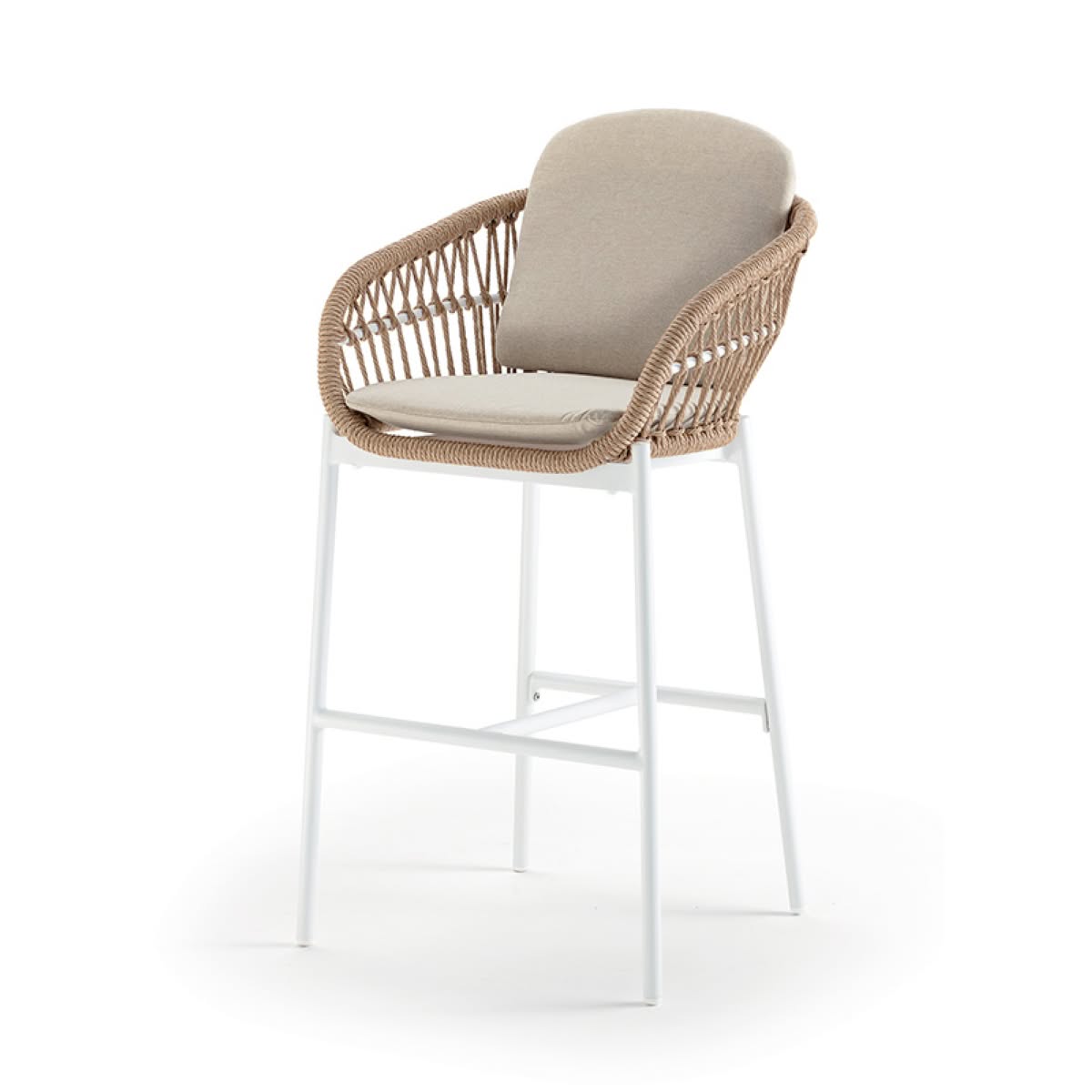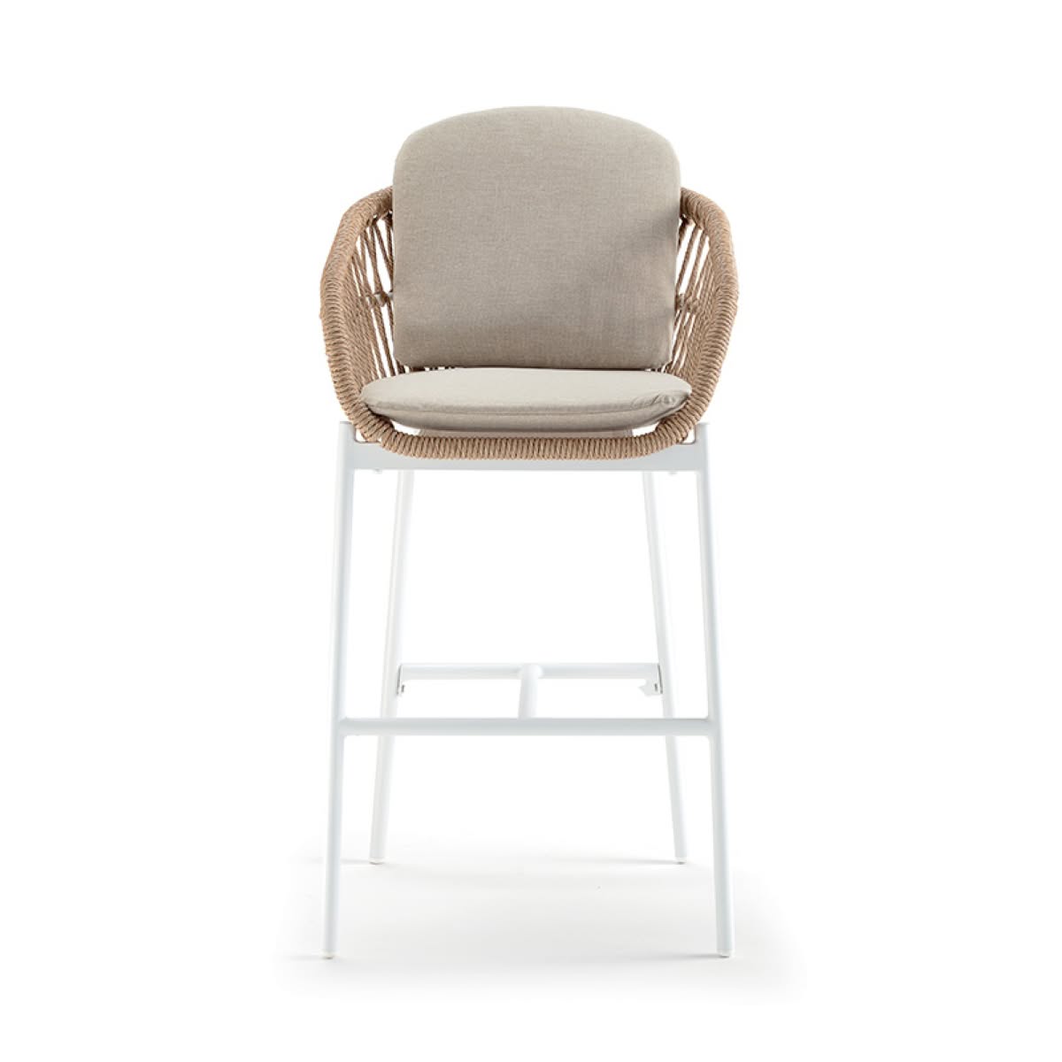 Elba Stool Grattoni è lo sgabello da giardino di design in alluminio con rivestimento in corda sintetica wintech. Cuscineria in tessuto Olefin e gomma drenante.
