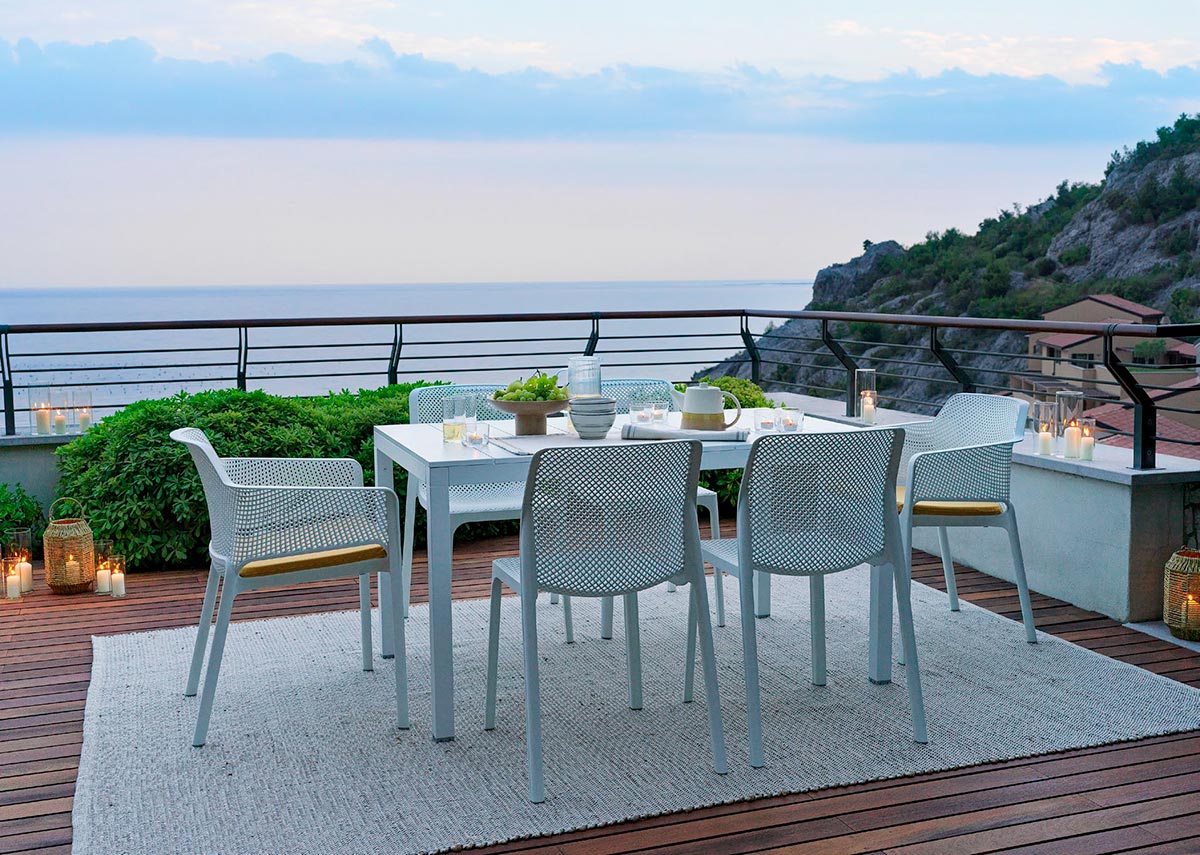 Rio 140 Alu è il tavolo allungabile fino a ben 210 cm griffato Nardi Outdoor proposto con piano in alluminio verniciato e polipropilene trattato anti-UV colorato in massa. Questa nuova versione 2019 aumenta ancora più la resistenza ai graffi ed agli agenti atmosferici! Le gambe squadrate gambe in alluminio verniciato sono en pendant cromatico con la struttura e sono dotate di piedini regolabili. Nuovo sistema di stipaggio delle allunghe al di sotto del piano per il massimo della praticità di utilizzo. Must have!