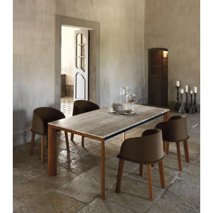 Tavoli pranzo e tavoli caffè con piani in accoya colore natural teak o in vitter colori metallo grigio chiaro (S22), grigio scuro (S23) e corten (S24).