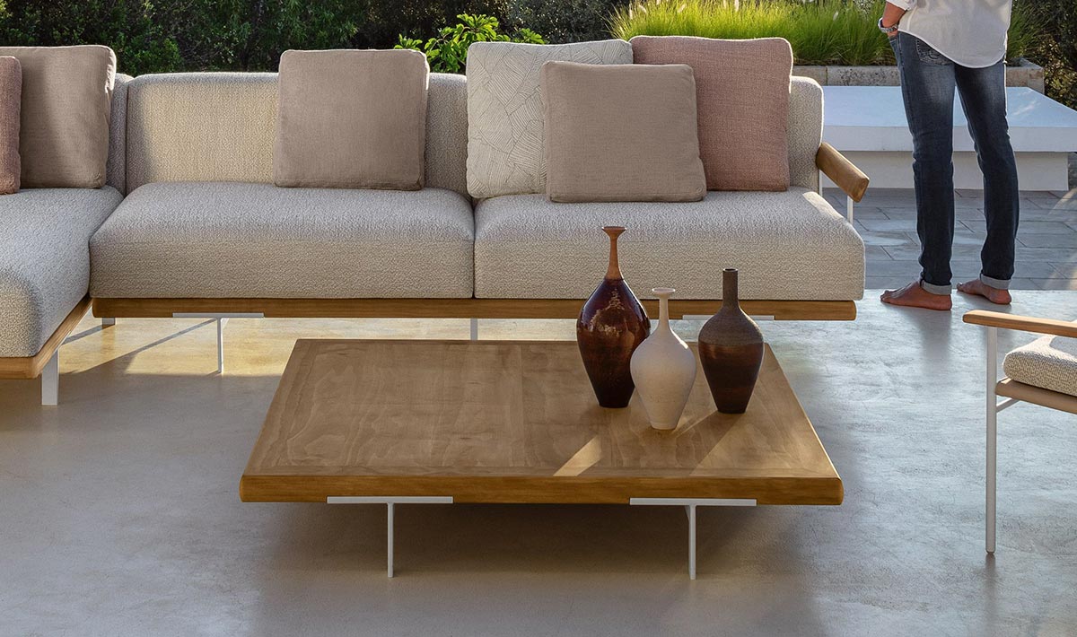 Informale ed elegante, contemporanea ma legata alla tradizione. La collezione Allure, firmata Christophe Pillet, nasce dal desiderio di unire eleganza ed informalità. Una modularità inconsueta che, partendo da delicati piedini in alluminio si sviluppa in orizzontale attraverso una solida cornice in legno d’ Accoya. La cuscineria geometrica e lineare, di diverse dimensioni, è in grado di dar vita a diverse combinazioni e scenari. Il risultato è una collezione dall’animo inquieto in grado di conferire carattere ad ambienti outdoor in perenne mutamento.