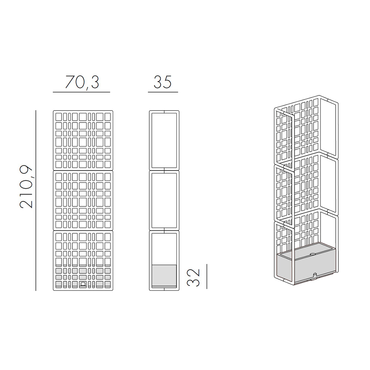 Sipario 3 Divisorio modulare è un sistema divisorio modulare autoportante da esterno configurabile a piacere, ideale per dividere gli spazi all’aperto. Costituito da 3 elementi grigliati facilmente agganciabili fra loro senza l’uso di viti e di vaso contenitore per piante autoirrigante. I moduli possono essere impilati in verticale per un’altezza massima di 3 elementi. Per garantire la stabilità del prodotto il vaso deve essere riempito con una zavorra di almeno 30 kg.