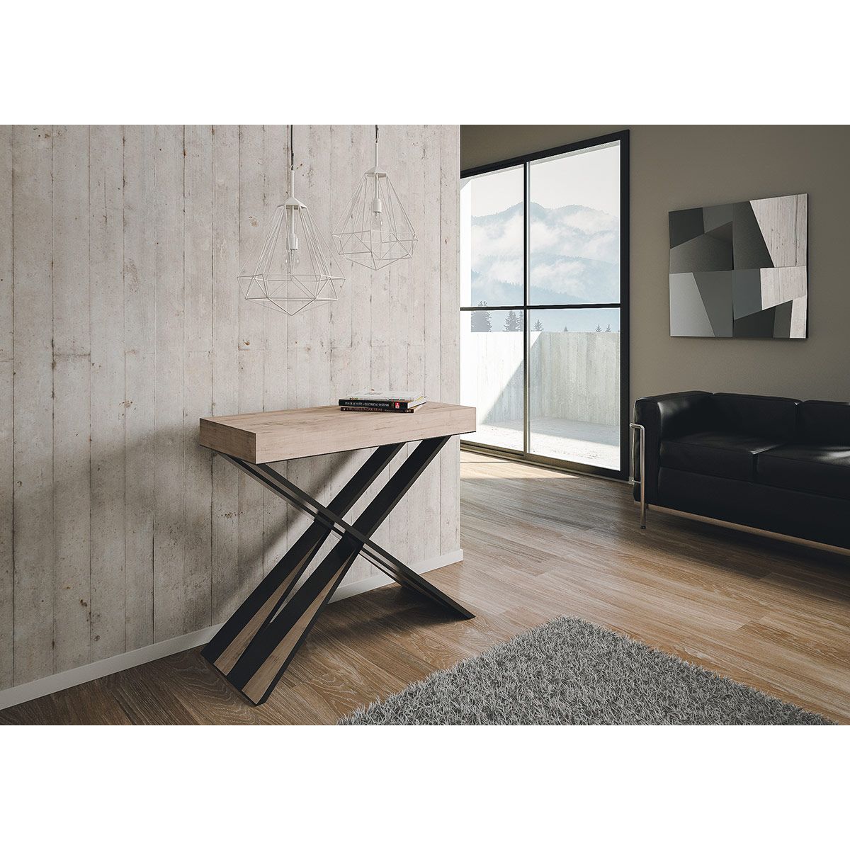 La consolle allungabile Diago rappresenta la soluzione ideale per chi desidera arredare il proprio ambiente con stile e ricercatezza in pochissimo spazio! La consolle Diago si caratterizzata prevalentemente per la sua struttura in ferro a "X" e per l'effetto materico dei suoi piani proposti in : Bianco frassino, Quercia natura, Cemento, Abete natura e Abete tinto. Utilizzando tutte e 5 le allunghe da 52 cm si estende raggiungendo la lunghezza massima di 300 cm (290 cm solo per la finitura in abete) permettendogli così di ospitare comodamente fino a 14 persone. Questa solida e pratica consolle si presta magnificamente per essere inserita in ambienti classici, contemporanei o ultra moderni dimostrandosi molto stabile ma nel caso in cui si volesse aumentarne la stabilità è possibile acquistare il sistema di supporto a 4 appoggiaterra o l'innovativo supporto centrale con porta allunghe. Disponibile come optional la pratica sacca riponi allunghe. Non rinunciare alla qualità, scegli il Made in Italy!