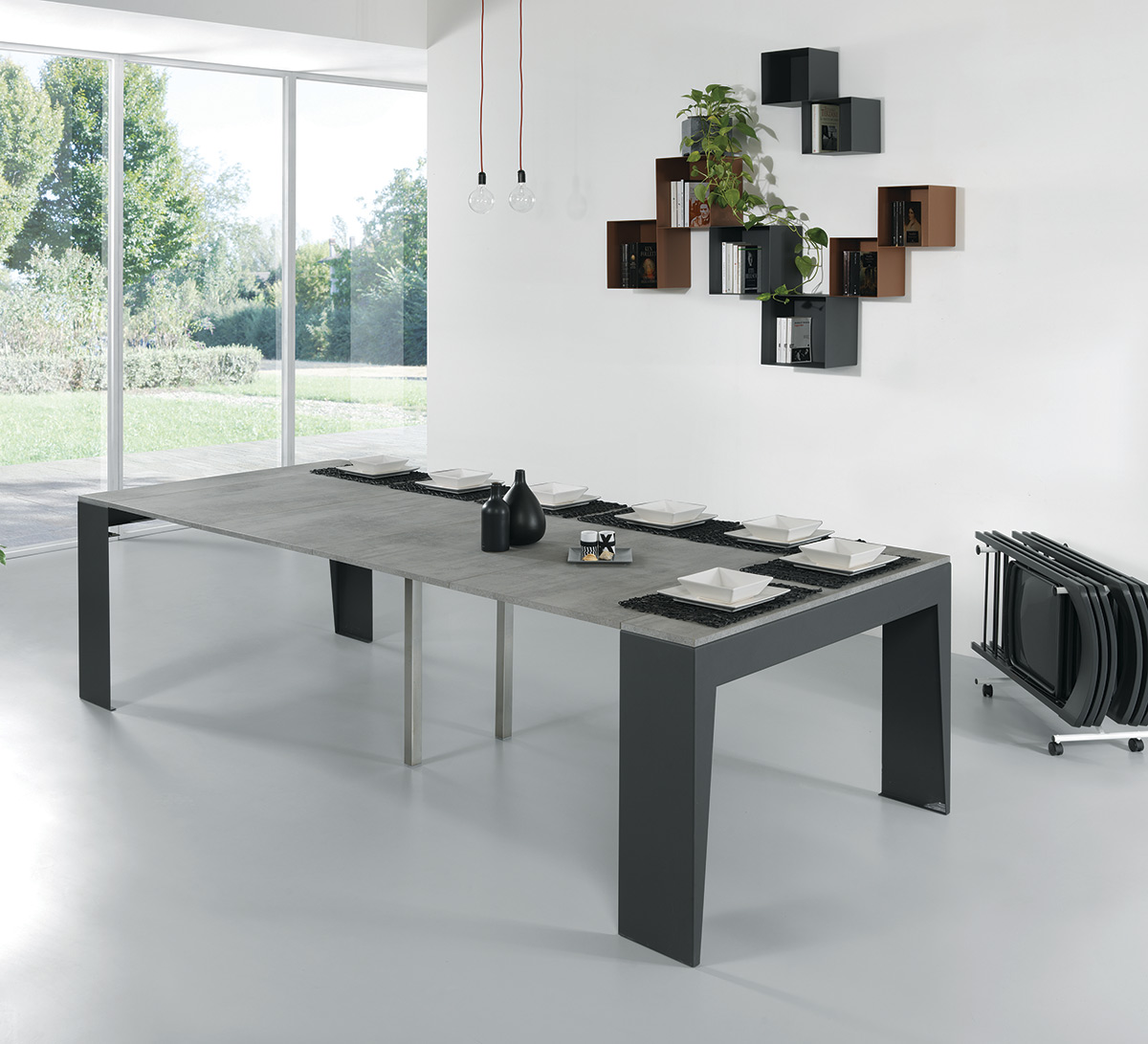 Tavolo consolle Marvel Plus 90 con 6 sedie Zeta e carrellino 0/412.comp è una praticissima composizione griffata Pezzani caratterizzata da un consolle allungabile fino a 285 cm, da 6 sedie Zeta e da un comodissimo carrellino portasedie. La consolle Marvel Plus viene proposta con struttura in lamina d'acciaio verniciata e top con 4 allunghe da 60 cm. in laminato Ecologico da 18 mm disponibile in tante eleganti finiture.