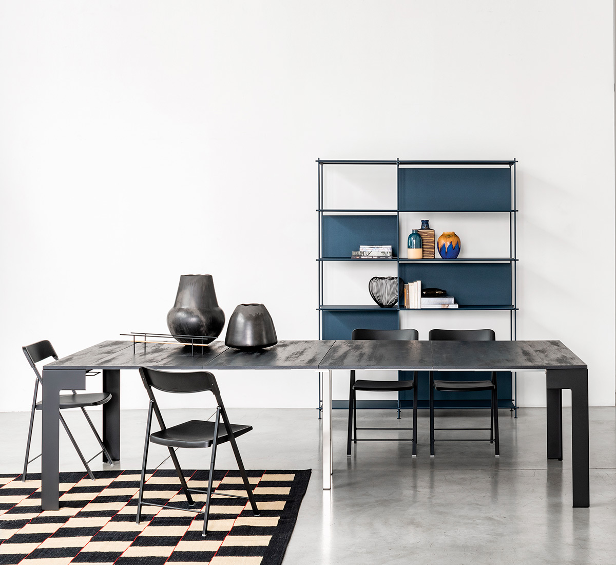 Ulisse 0/415 è il tavolo consolle allungabile P90 griffato Pezzani con struttura in lamina d'acciaio verniciata e top con 4 allunghe in laminato Ecologico da 18 mm proposto in tante eleganti finiture. Le 4 allunghe da 60 cm. cad trovano alloggiamento all'interno della struttura e diventano il fondo della consolle. Gambe pieghevoli e guida estensibile in alluminio. Ulisse raggiunge la lunghezza di 285 cm ed è in grado di accogliere fino a 14 persone.