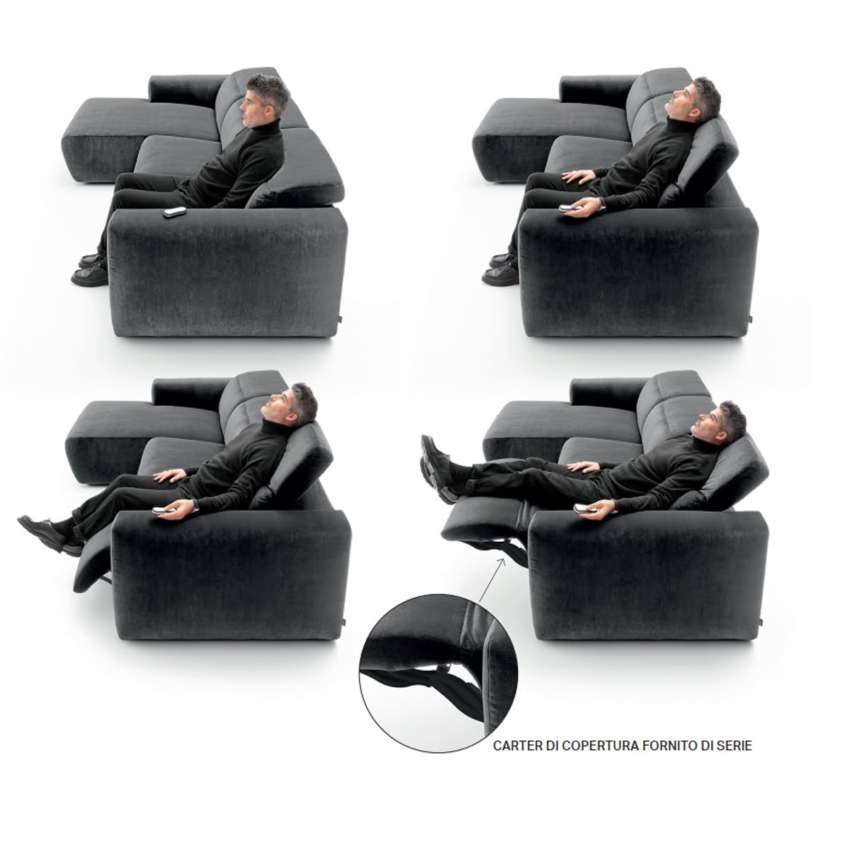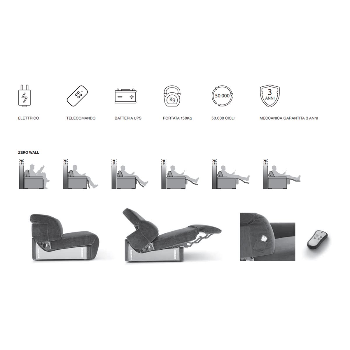 Il pratico telecomando aziona due motori elettrici in modo indipendente per regolare poggiatesta e/o seduta. Grazie al meccanismo Zero Wall, si può scegliere l’inclinazione preferita senza allontanare il divano dal muro. Nel caso in cui si opti per una seduta fissa insieme a una elettrica, è necessario specificare la posizione di quest’ultima (dx/sx).