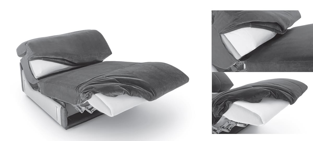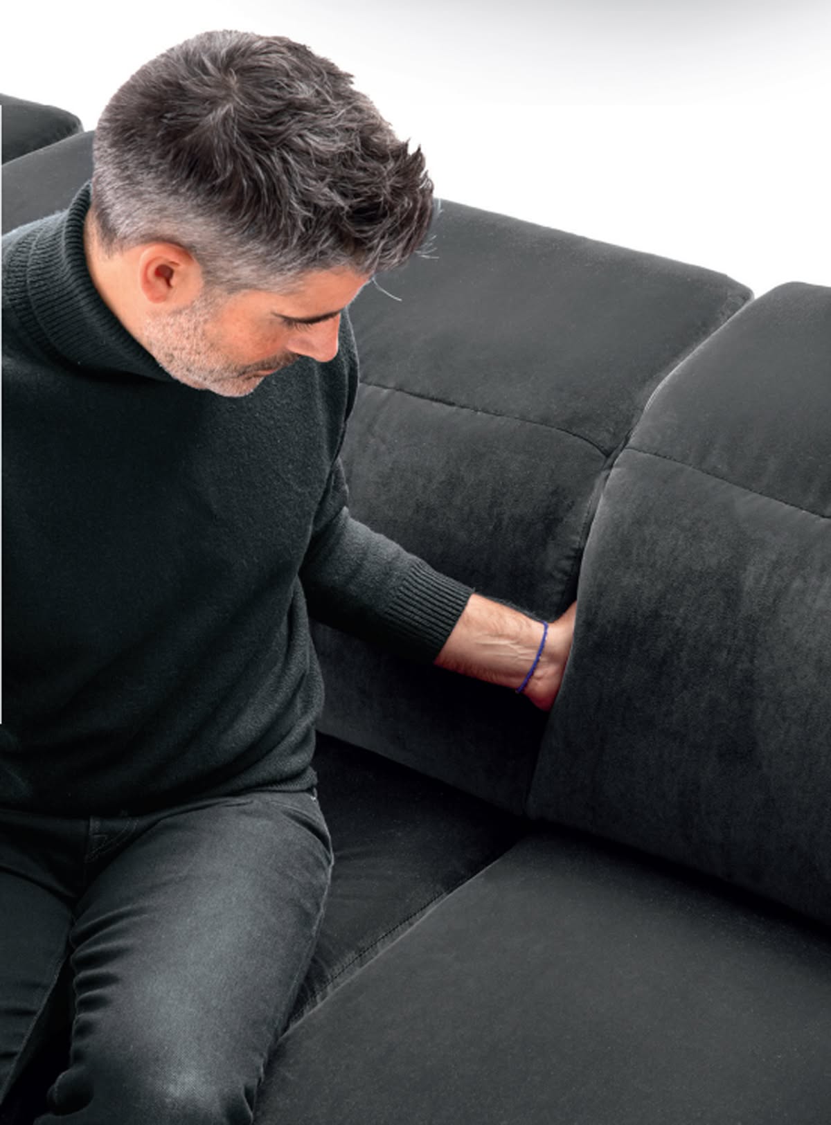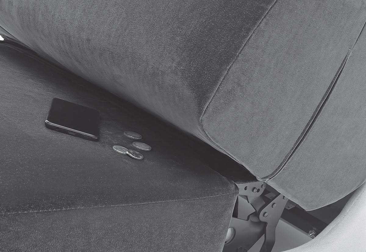 Anche quando il divano si inclina, nessun oggetto può fi nire all’interno della struttura grazie a un tessuto di collegamento tra seduta e schienale.