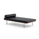 Struttura: in legno massello di frassino tinto noce. 11 cinghie di sospensione in cuoio per il materasso. Gambe: tubolari in acciaio cromato lucido.