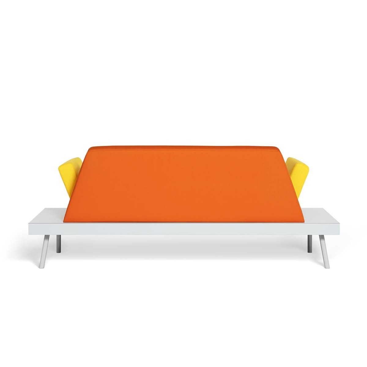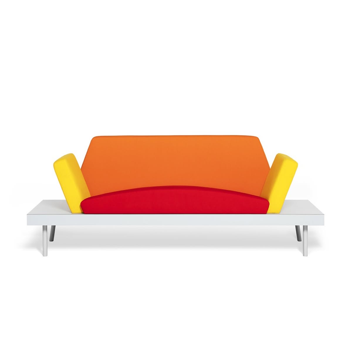 Memphis Milano Dublin Divano di Marco Zanini è un divano di design in legno rivestito in laminato decorativo, gambe in metallo verniciato, rivestito in tessuto. Design futuristico e colori vivaci, sono i caratteri che ben descrivono Dublin di Marco Zanini. L’imbottitura arancione della seduta di Dublin poggia sopra un basamento lineare in laminato decorativo bianco e gambe in metallo verniciato che giocano, a contrasto, con il tessuto caldo e avvolgente.