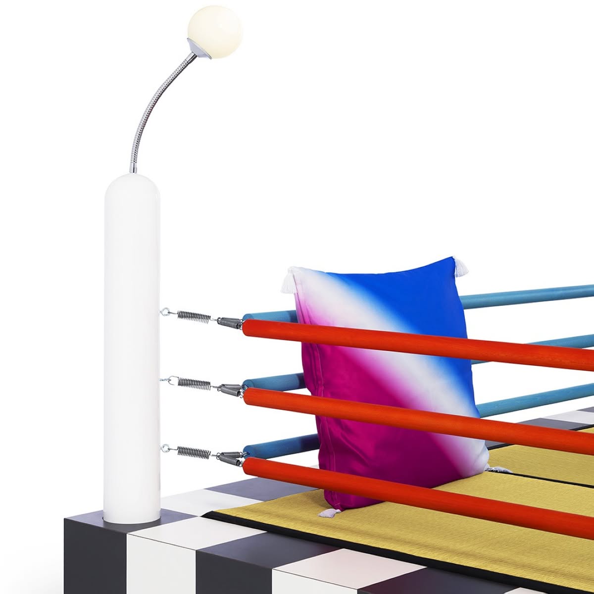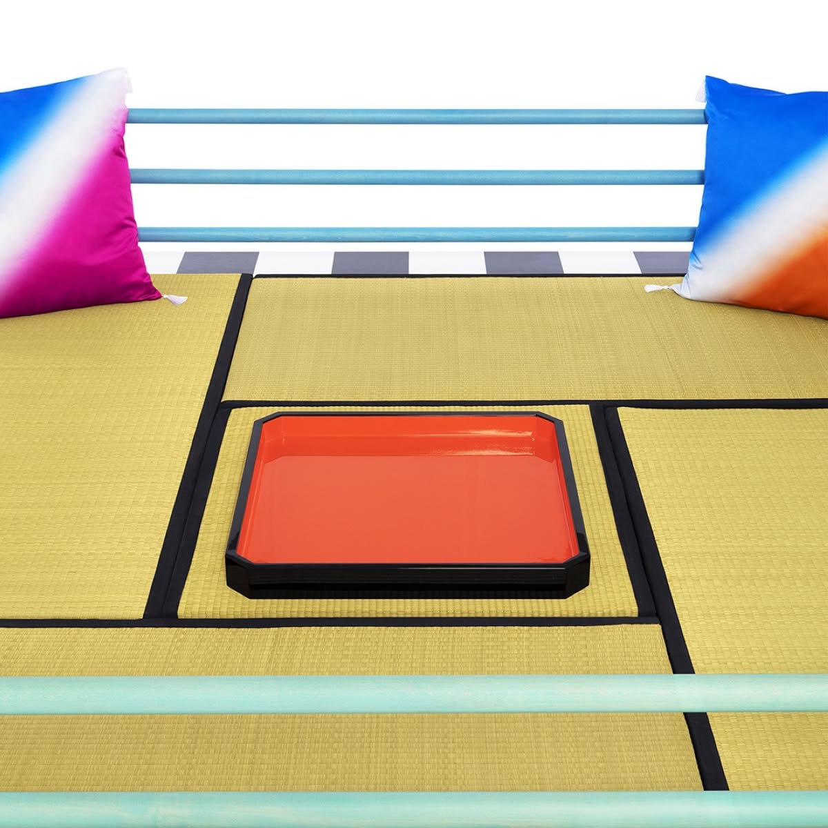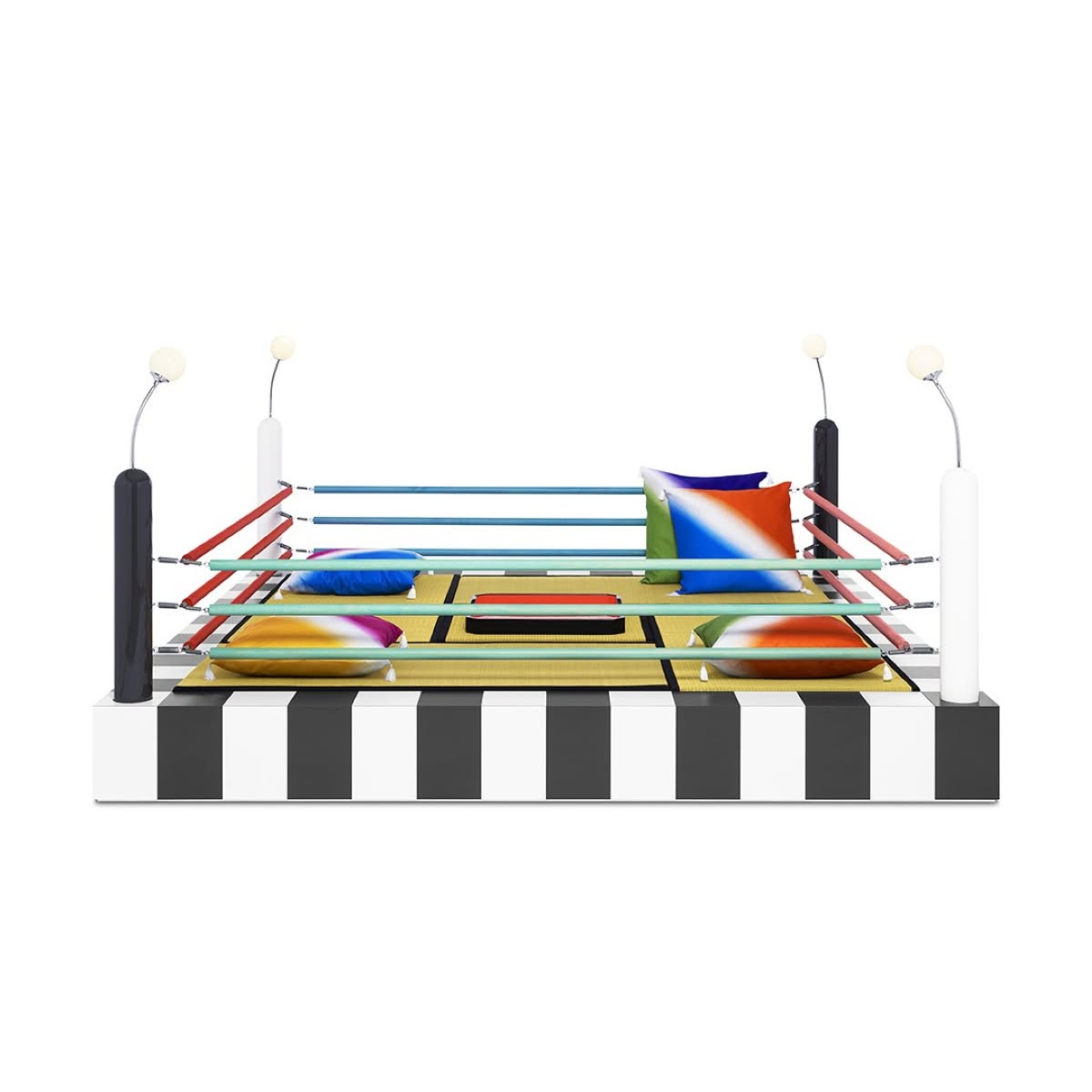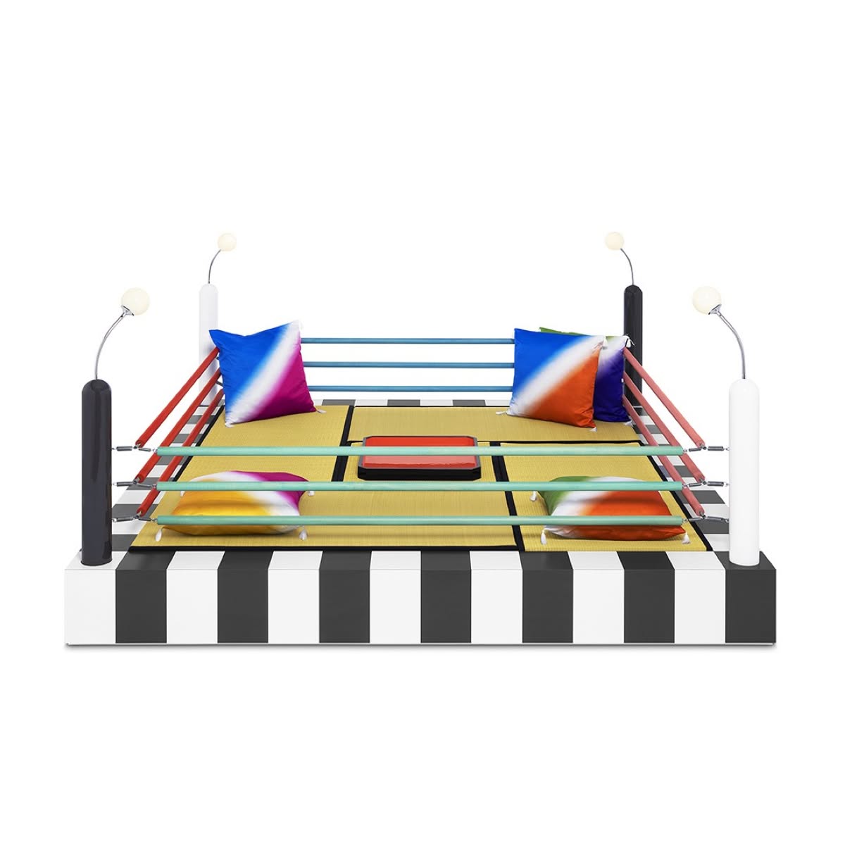 Memphis Milano Tawaraya Ring Masanori Umeda | Ring da box domestico in legno rivestito in laminato decorativo, tatami tradizionale giapponese in paglia intrecciata, elementi in metallo e legno laccato. Cusciname imbottito e rivestito in seta