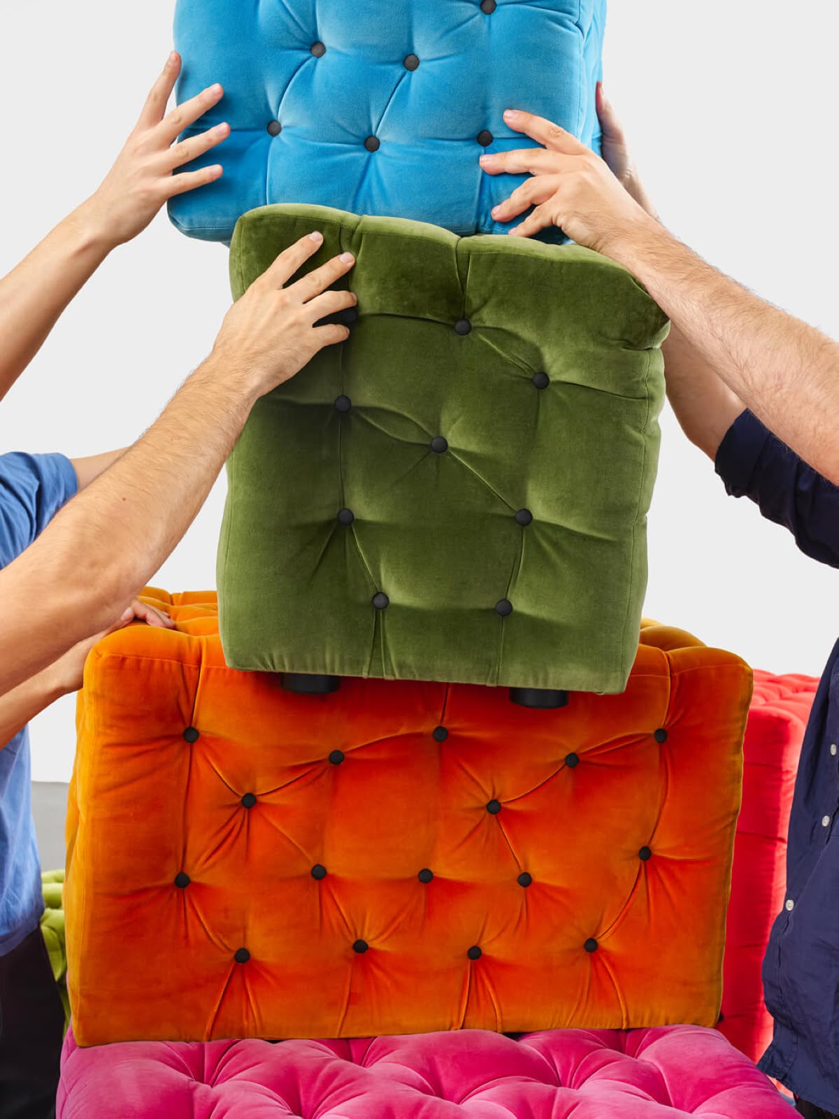 Meritalia La Michetta C02 Divano modulare è il divano di design componibile progettato da Gaetano Pesce, fatto di moduli eclettici, disponibili in diverse dimensioni e colori, che possono essere continuamente riorganizzati a seconda del gusto e delle necessità. Per i milanesi, la michetta è il pane quotidiano. È l’odore del forno in fondo alla strada, è il sapore dello stare insieme senza particolare ragione, se non la voglia di condividere un momento. È la forma più riconoscibile - una ‘rosetta’ fatta di petali di lievito e farina - eppure mai uguale, irregolare perché fatta a mano. Cosa fanno di questi concetti Meritalia® e Gaetano Pesce, il più radicale tra i radicali? Li mischiano, impastano e infine sfornano imbottiti fuori dall’ordinario, ogni giorno fragranti come il pane. Un divano pensato per ridefinire la quotidianità: La Michetta di Meritalia® è una delizia per gli occhi, che si abbuffano delle forme irregolari di ogni modulo, si saziano dei colori e materiali a disposizione, e ne pregustano gli usi. Un divano non conforme a uno stile predeterminato, non progettato come complemento d’arredo ma come protagonista poliedrico della reinvenzione della domesticità. Un oggetto fatto di tanti oggetti, moduli eclettici che non possono che comporre schemi fuori dagli schemi. Gaetano Pesce concepisce La Michetta come un gioco tra la mente che la progetta, le mani che la producono, e la creatività di chi la sceglie. La lavorazione capitonnè lievita in maniera randomica, ora flettendo ora crescendo, in contrasto con la geometria di ogni modulo rettangolare o cubico, delimitato dalla struttura in legno. I bottoni segnano gli avvallamenti della superficie e la punteggiano, tratteggiando un motivo tridimensionale e irregolare che invita a esplorare la comodità della seduta. La Michetta è per sedersi, per distendersi; anzi, sedersi e distendersi diventano azioni da riconsiderare, a seconda che il modulo sia orizzontale, verticale, seduta o schienale o bracciolo, singolo o multiplo. È un divano accogliente, icona di un comfort condiviso: una comodità che invita alla convivialità. I moduli possono essere continuamente riorganizzati, permettendo di immaginare configurazioni varie, che ogni volta riattivano e rinnovano gli spazi più diversi, intimi come un salotto di casa o di rappresentanza, pensati per accogliere e stupire!