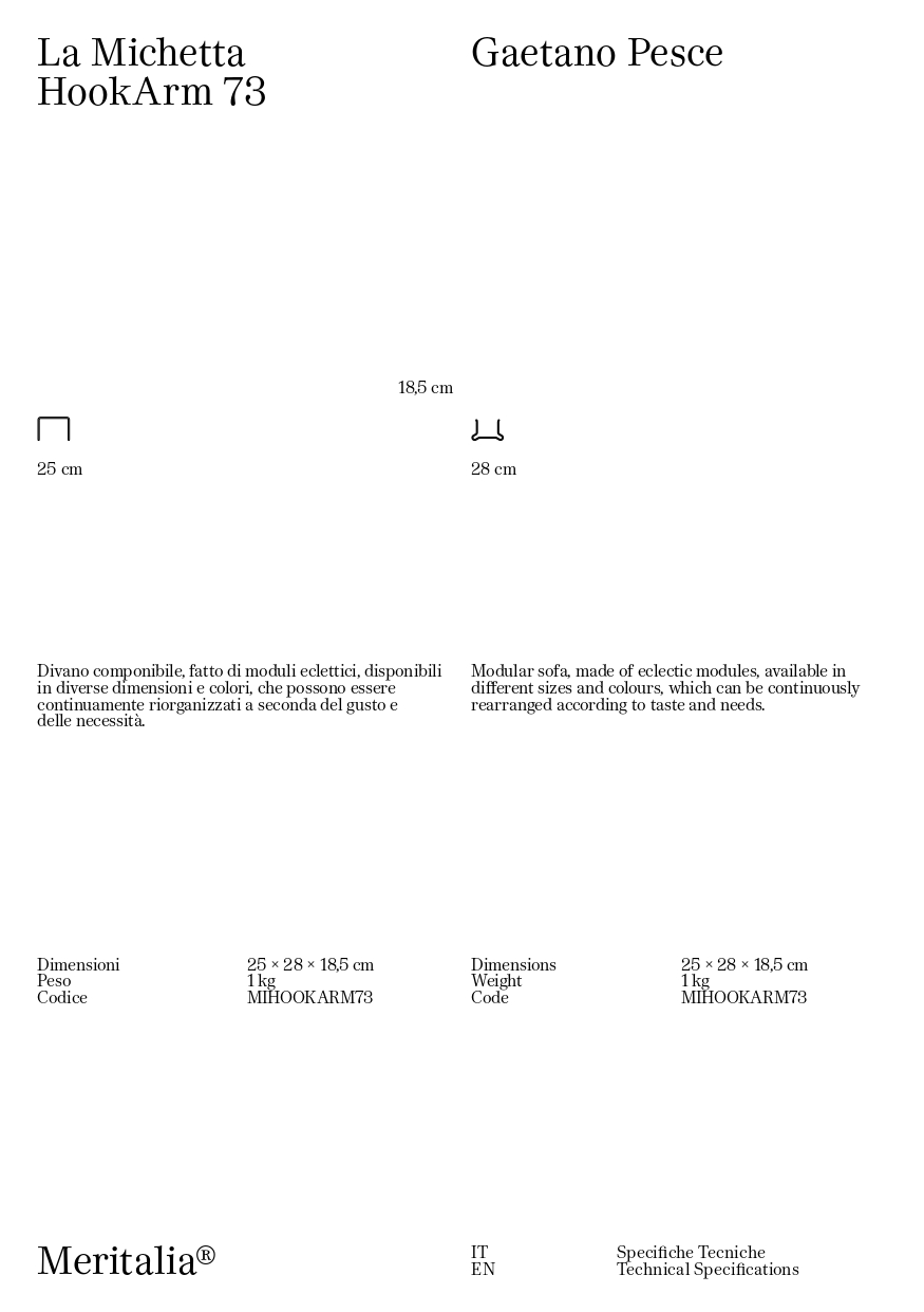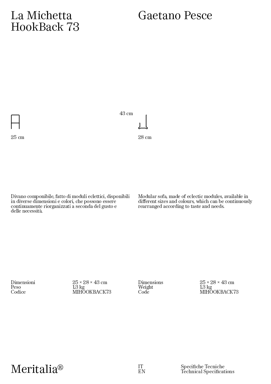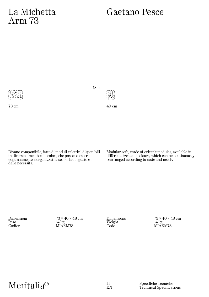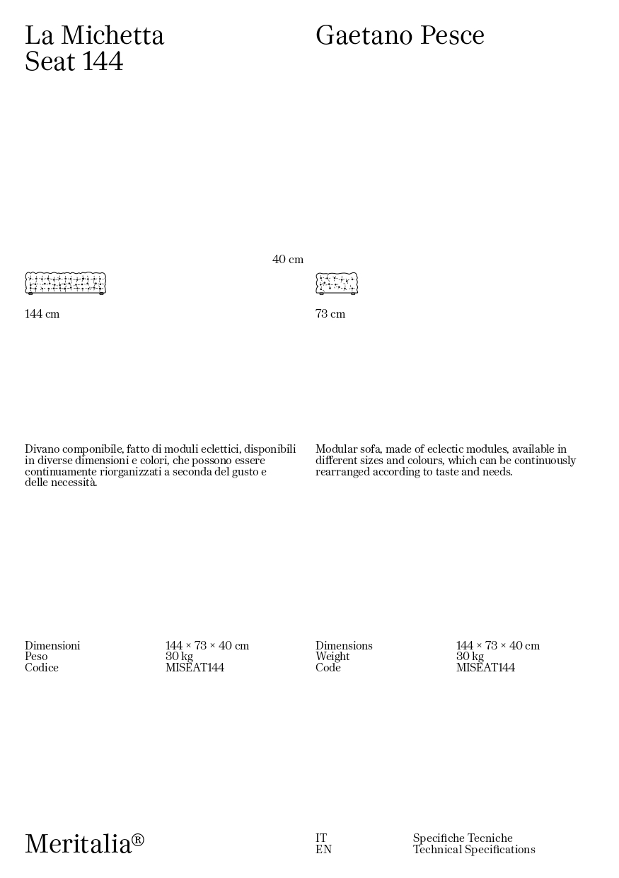 Meritalia La Michetta C03 Divano modulare è il divano di design componibile progettato da Gaetano Pesce, fatto di moduli eclettici, disponibili in diverse dimensioni e colori, che possono essere continuamente riorganizzati a seconda del gusto e delle necessità. Per i milanesi, la michetta è il pane quotidiano. È l’odore del forno in fondo alla strada, è il sapore dello stare insieme senza particolare ragione, se non la voglia di condividere un momento. È la forma più riconoscibile - una ‘rosetta’ fatta di petali di lievito e farina - eppure mai uguale, irregolare perché fatta a mano. Cosa fanno di questi concetti Meritalia® e Gaetano Pesce, il più radicale tra i radicali? Li mischiano, impastano e infine sfornano imbottiti fuori dall’ordinario, ogni giorno fragranti come il pane. Un divano pensato per ridefinire la quotidianità: La Michetta di Meritalia® è una delizia per gli occhi, che si abbuffano delle forme irregolari di ogni modulo, si saziano dei colori e materiali a disposizione, e ne pregustano gli usi. Un divano non conforme a uno stile predeterminato, non progettato come complemento d’arredo ma come protagonista poliedrico della reinvenzione della domesticità. Un oggetto fatto di tanti oggetti, moduli eclettici che non possono che comporre schemi fuori dagli schemi. Gaetano Pesce concepisce La Michetta come un gioco tra la mente che la progetta, le mani che la producono, e la creatività di chi la sceglie. La lavorazione capitonnè lievita in maniera randomica, ora flettendo ora crescendo, in contrasto con la geometria di ogni modulo rettangolare o cubico, delimitato dalla struttura in legno. I bottoni segnano gli avvallamenti della superficie e la punteggiano, tratteggiando un motivo tridimensionale e irregolare che invita a esplorare la comodità della seduta. La Michetta è per sedersi, per distendersi; anzi, sedersi e distendersi diventano azioni da riconsiderare, a seconda che il modulo sia orizzontale, verticale, seduta o schienale o bracciolo, singolo o multiplo. È un divano accogliente, icona di un comfort condiviso: una comodità che invita alla convivialità. I moduli possono essere continuamente riorganizzati, permettendo di immaginare configurazioni varie, che ogni volta riattivano e rinnovano gli spazi più diversi, intimi come un salotto di casa o di rappresentanza, pensati per accogliere e stupire!