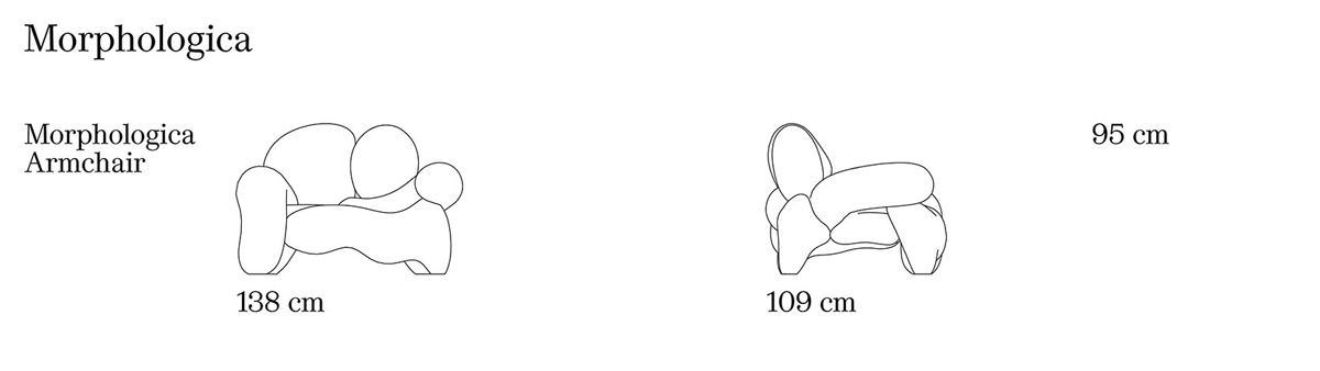 Meritalia Morphologica Armchair è il poltrona di design di Misha Kahn costituita da un assemblaggio di 8 moduli in poliuretano espanso rivestito in tessuto. Le possibilità cromatiche sono molteplici. Morphologica sfida i confini stabiliti della produzione, ignorando il paradigma di forma e funzione e guardando oltre l’idea di organico vs. razionalista, per creare oggetti dall’architettura (apparentemente) impossibile. Morphologica è, infatti, un progetto che applica la logica dell'architettura e dell'ingegneria alle forme naturali, cercando di isolarne la struttura intrinseca; poi è un'idea, scolpita in volumi irregolari, evocata dai colori e resa manifesta in poliuretano e tessuto; infine, è la storia dell'incontro di sensibilità affini: Misha Kahn e Meritalia®. L’artista americano offre la sua risposta viscerale alla poetica di Meritalia®, definendo con il suo progetto il significato di radicalità contemporanea, nell’arte come nel design. Traendo ispirazione incoerente dal corpo, Kahn guarda oltre i riferimenti convenzionali alla bellezza del corpo umano e si concentra sulla meravigliosa complessità dell’interno. Stimolato dalla sensuale morbidezza delle parti celate, Kahn crea elementi organici modulari, carnosi e morbidi, realizzati in schiuma di poliuretano ricoperta poi di tessuto in diversi colori. La poltrona e il divano Morphologica sono costituiti da un assemblaggio di moduli – 12 per il divano e 8 per la poltrona – in poliuretano espanso rivestito in tessuto. Le possibilità cromatiche sono infinite, si abbinano alla molteplicità della pop-modernità di Meritalia®. Una solida struttura in metallo consente alle forme di schiuma di aggrovigliarsi ed espandersi, creando un divano sperimentale, più sexy che giocoso, addirittura “scioccante”, come lo definisce lo stesso Kahn. Nella sua intrinseca identità radicale, Morphologica è un commento sul modo in cui guardiamo le cose, spesso en passant, e un invito a confrontarsi - piuttosto fisicamente - con la bellezza, inaspettata e non-canonica, di ciò che c'è sotto la superficie.
