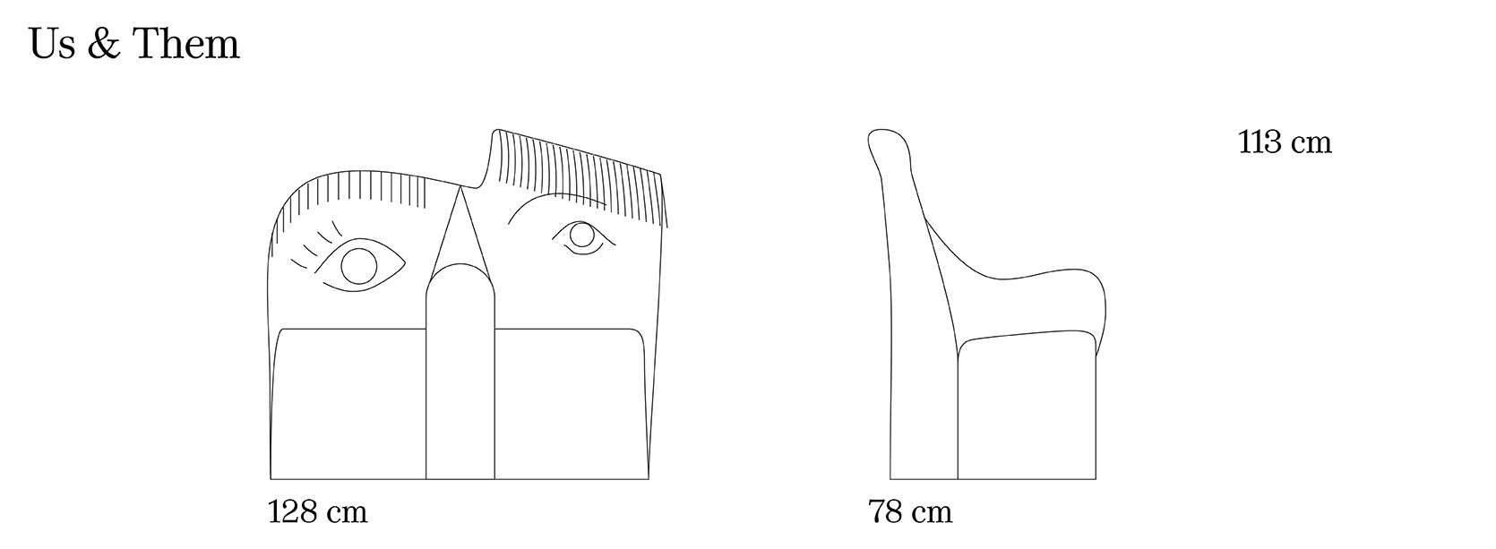 Meritalia Us & Them Divano è il divano di design a due posti progettato da Gaetano Pesce che rappresenta la combinazione tra due individui in un volto antropomorfo. La fila di led luminosi sullo schienale del lato sinistro rende Us&Them una seduta ancor più emozionale. Us&Them è un’insolita combinazione di funzione e figura: un volto diventa un divano per due. Gaetano Pesce anche con questa seduta riesce a suscitare l’effetto sorpresa: non più un divano con la forma di divano. Us&Them, unito in una sola entità, rappresenta una coppia che si unisce in una sola realtà. Il design si cimenta con ironia nella creazione di un Giano bifronte. Sembra un unico volto, con il naso al centro. Citando il pensiero cubista espresso nella pittura di Picasso, Us&Them si caratterizza per il design antropomorfico e fisiognomico che guarda all’extra-ordinario dell'irrealtà: le proporzioni sfuggono alle normali leggi dell'anatomia per esagerare con i volumi. Gaetano Pesce indaga il rapporto tra anatomia e senso di identità individuale. Un divano a due posti: il mio e il tuo e un bracciolo solo, “il nostro”. I volti sono ricomposti come in un puzzle in cui gli elementi delle due sedute e il bracciolo centrale sono messi in evidenza dal contrasto cromatico. Il divano è interamente sfoderabile, i rivestimenti possono essere di diversi colori. L’illuminazione integrata nel dorso rende l’oggetto ancora più surreale: sul lato sinistro, i “capelli” sono una cascata di led luminosi ancorati alla struttura. Il colore, il coinvolgente figurativismo, l’innovazione della materia, la morbidezza delle forme, rendono Us&Them un oggetto affettivo che ci attrae e ci assomiglia.