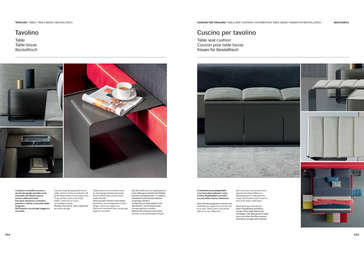 I tavolini in metallo curvato e verniciato grigio piombo sono inseribili nel ring di tutta la nostra collezione letti. Possono diventare comodini, panche e sedute a seconda delle esigenze. Più funzioni con design leggero e versatile. A richiesta sono disponibili i cuscini seduta tubolari realizzabili con tutti i tessuti della collezione.