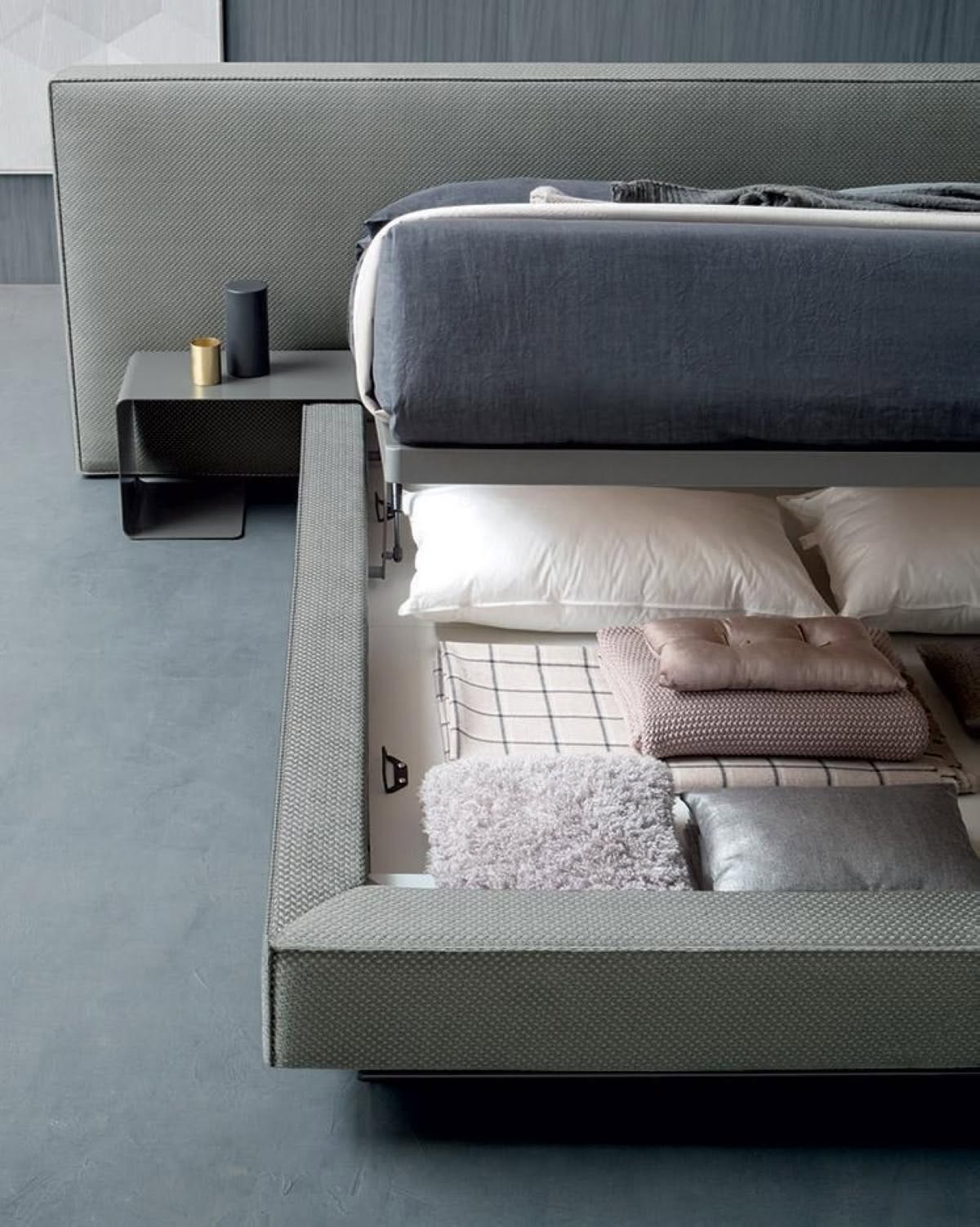 Letto Bowie XL Ring Kobe matrimoniale Felis è il letto di design dalle linee essenziali e dai volumi importanti per questo letto che esprime un vero e proprio concept d’arredo. Nonostante il piede da 13 cm, con un semplice gesto, la rete si solleva svelando un capace contenitore all’interno del giroletto. Gli elementi a bordo letto inoltre possono essere utilizzati come delle comode sedute. Optional i cuscini. I bordi in contrasto, sottolineano le forme della testiera e del giroletto. I tavolini, realizzati in metallo verniciato grigio piombo, possono scorrere sul giroletto. I tavolini in metallo curvato sono inseribili nel giroletto e diventano comodini, panche e sedute a seconda delle esigenze. Più funzioni quindi con design leggero e versatile. Sono disponibili a richiesta anche i cuscini a misura per l’utilizzo seduta. RETI - per livellare alla stessa altezza reti diverse nello stesso letto MECCANISMI 1. DYNAMIC: meccanica ad alzata semplice collaudata e certificata fino a 5.000 cicli. Telaio in acciaio verniciato a polveri epossidiche e con molle a gas tarate al peso del materasso. CONTENITORE NEL RING
